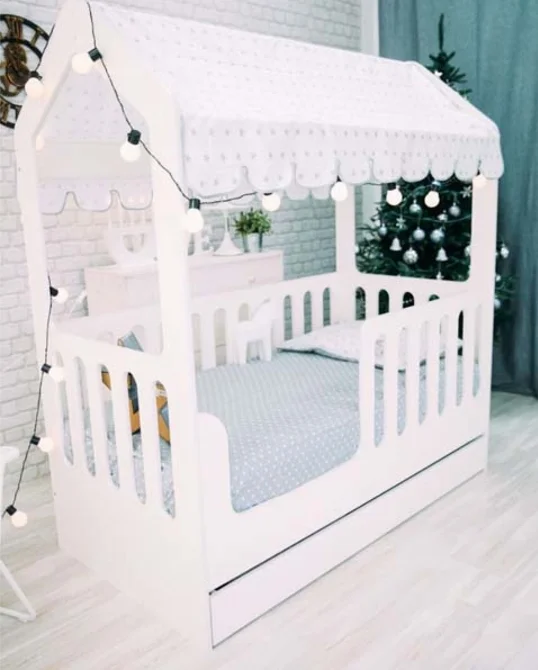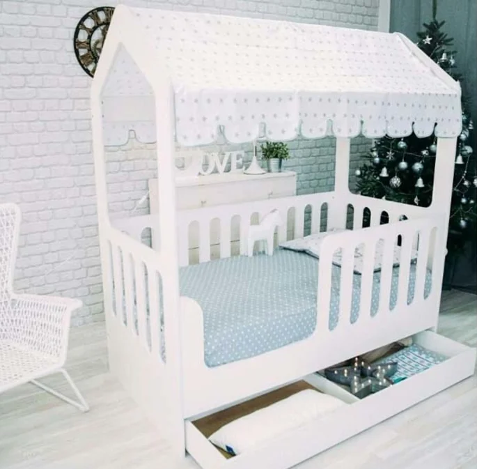 Высота от пола до спального места 55 см. Высота бортика 65 см. Ширина ячейки забора 6,5 см. Кровать имеет выдвижной ящик глубиной 13 см., выкатывается полностью на колесиках (6 штук).
