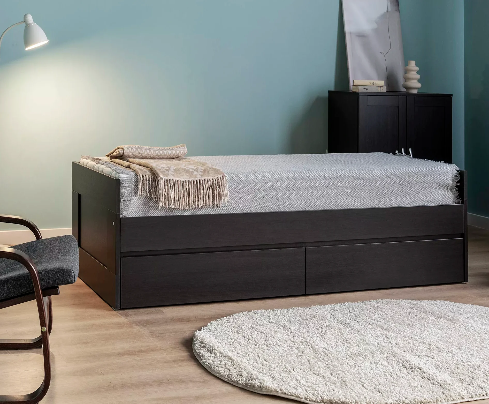 Рекомендуем приобретать 2 матраса, размером 90 х 200, высотой 8-11см (высота от реечного основания до бокового бортика 22 см).