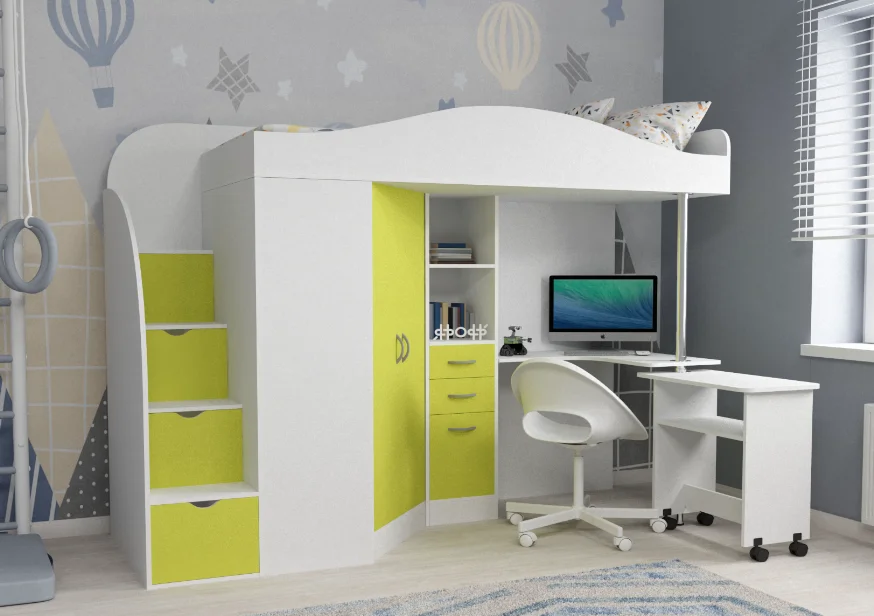 В угловом шкафу с распашными дверцами 3 полки и штанга длинной 80 см перпендикулярно задней стенке. Рядом со шкафом две открытые полки, под ними два выдвижных ящика и распашной ящик, в нижним распашном ящике полки нет, стол на колесных опорах, стол поворачивается на 360 градусов.