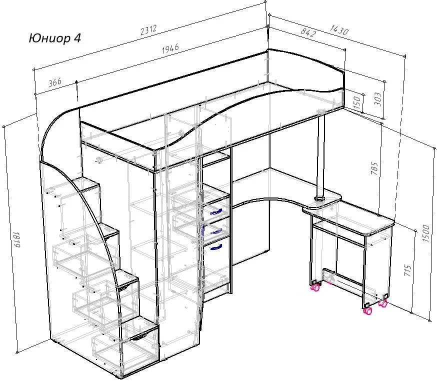 В угловом шкафу с распашными дверцами 3 полки и штанга длинной 80 см перпендикулярно задней стенке. Рядом со шкафом две открытые полки, под ними два выдвижных ящика и распашной ящик, в нижним распашном ящике полки нет, стол на колесных опорах, стол поворачивается на 360 градусов.