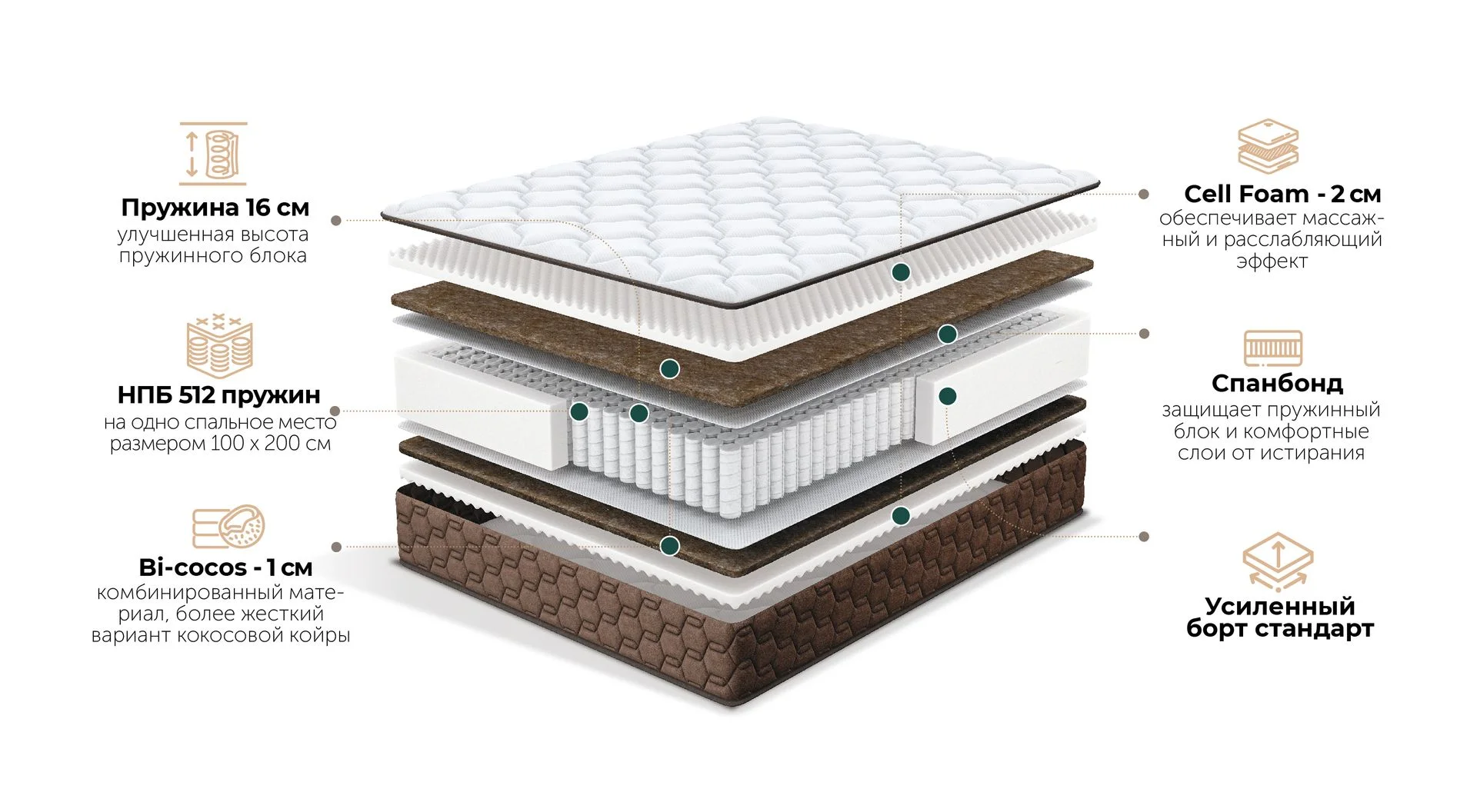 Независимый пружинный блок 512 пружин на одно сп.место размером 100*200 см - 16 см