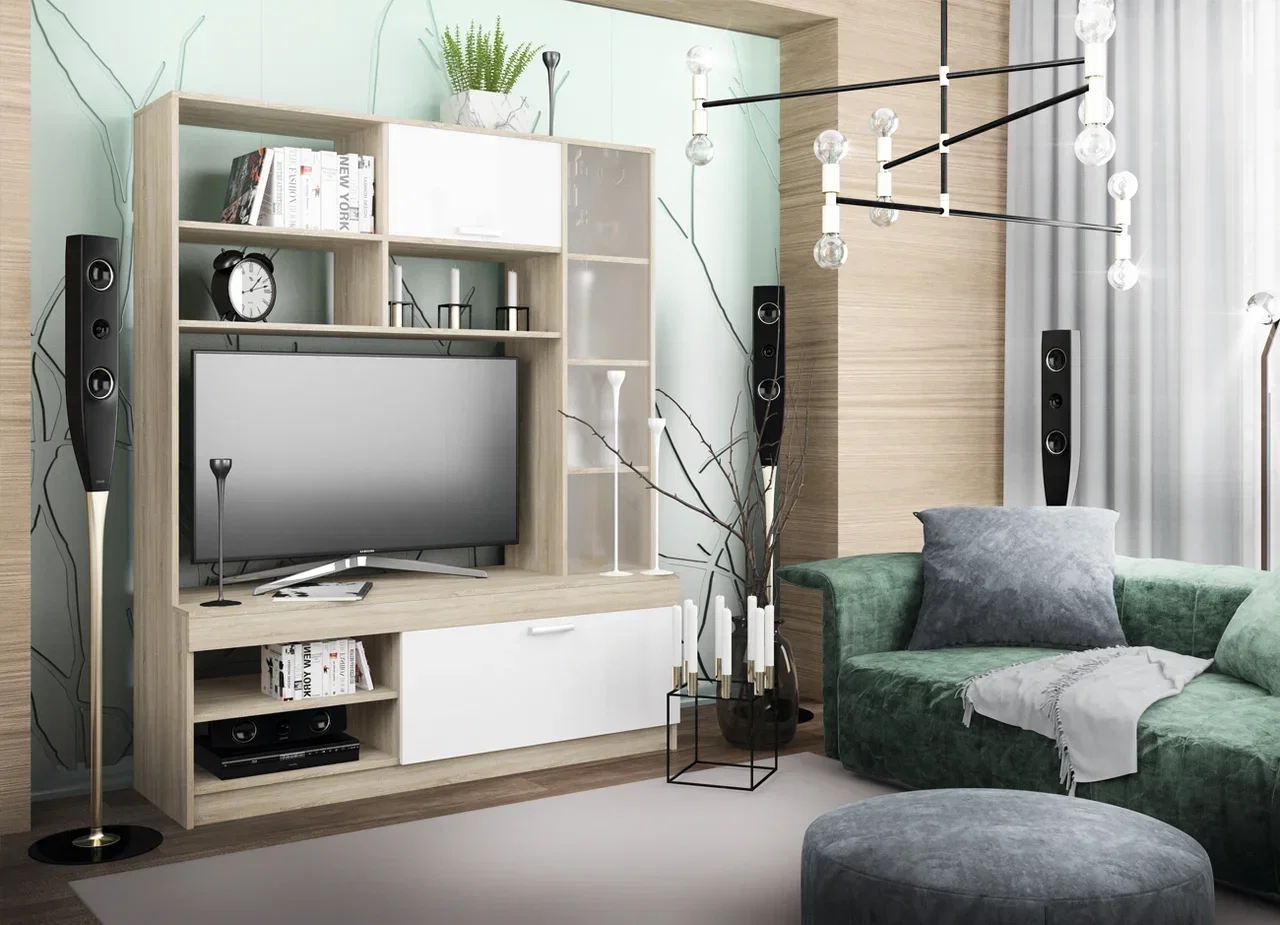 В комплект гостиной входят: ниша/тумба для ТВ, полки навесные, стеллаж и тумба под ТВ. Это позволяет максимально эффективно использовать пространство и разместить все необходимые предметы.