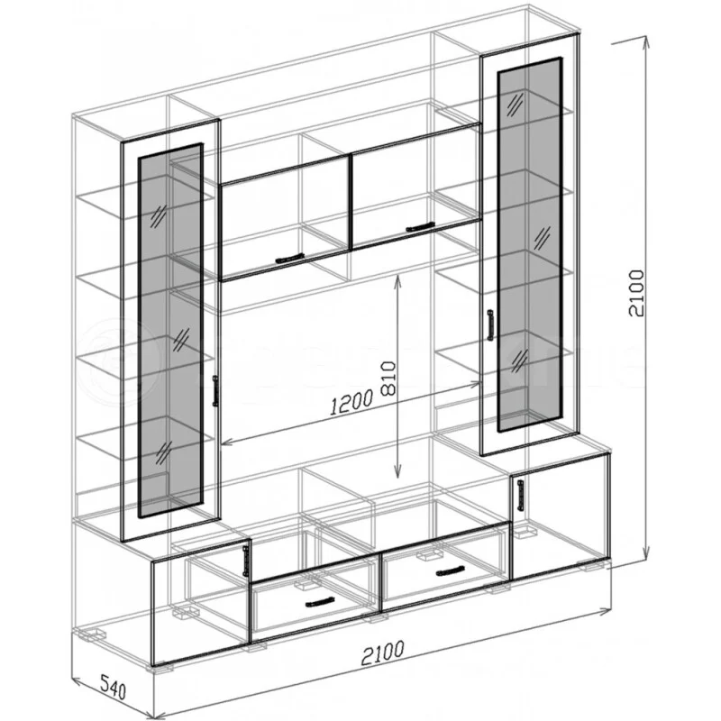 Размер ниши под ТВ 1200 х 810 мм. Витрины с газовыми кронштейнами и амортизаторами. Ящики полного выдвижения.