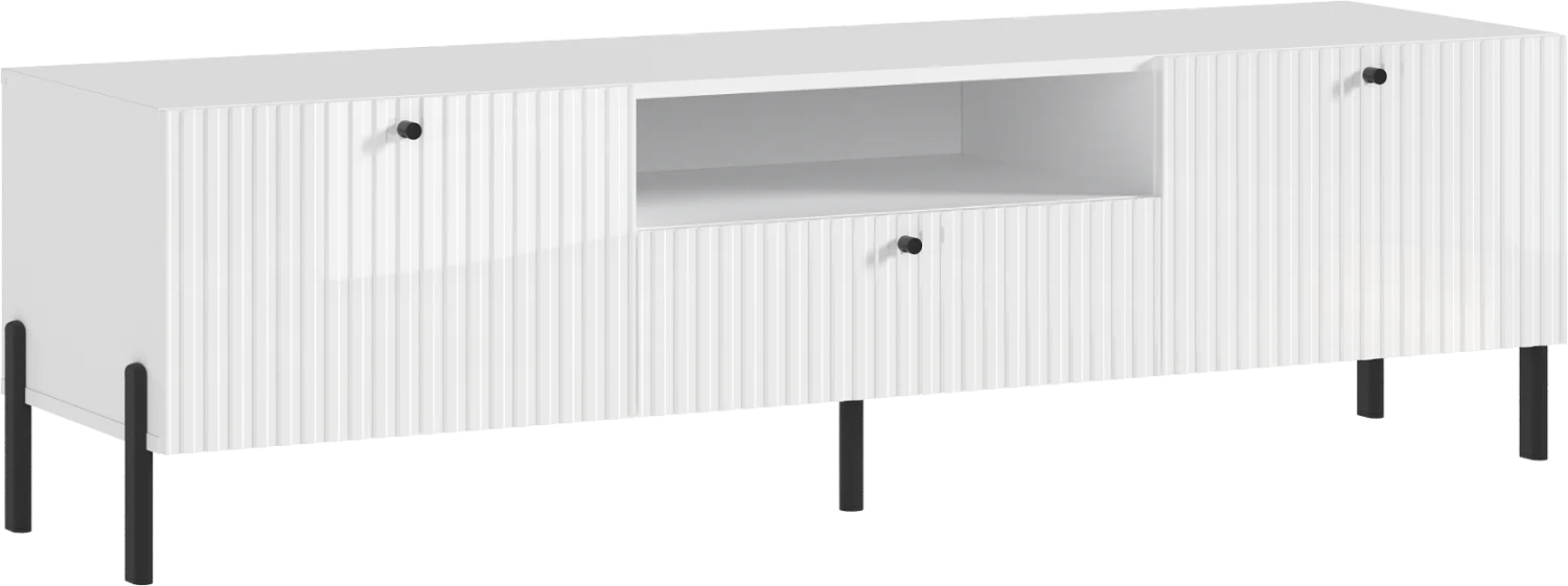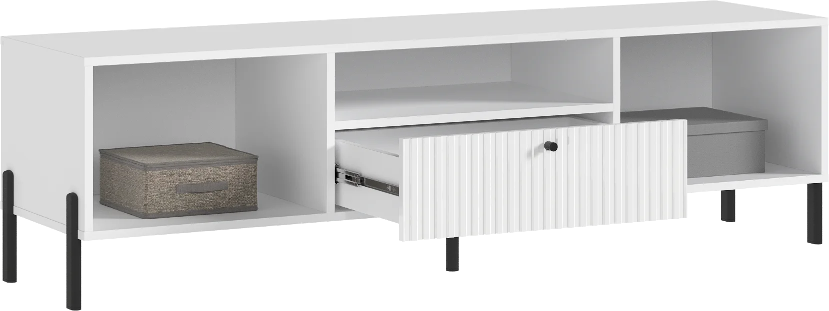Тумба под телевизор с фрезерованными фасадами и современными шариковыми направляющими обеспечивает легкость в использовании и долговечность.