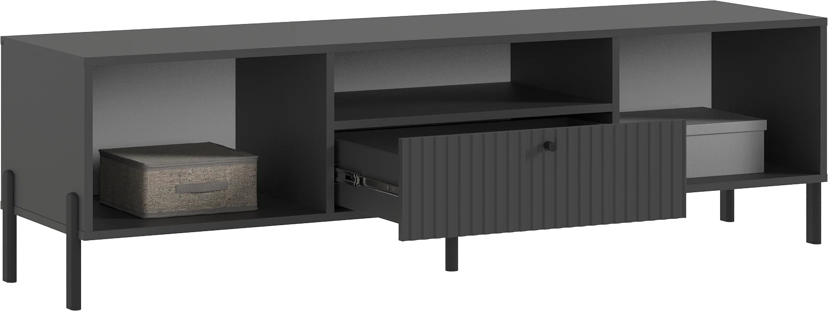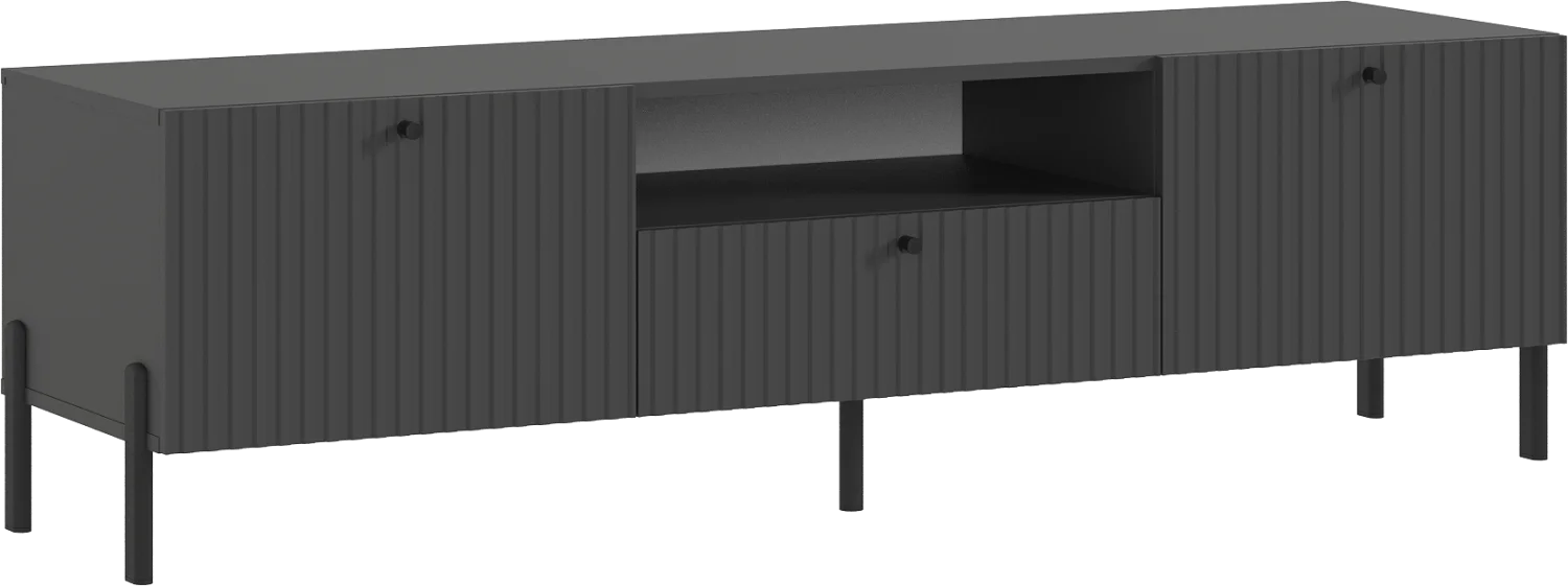 Тумба под телевизор с фрезерованными фасадами и современными шариковыми направляющими обеспечивает легкость в использовании и долговечность.