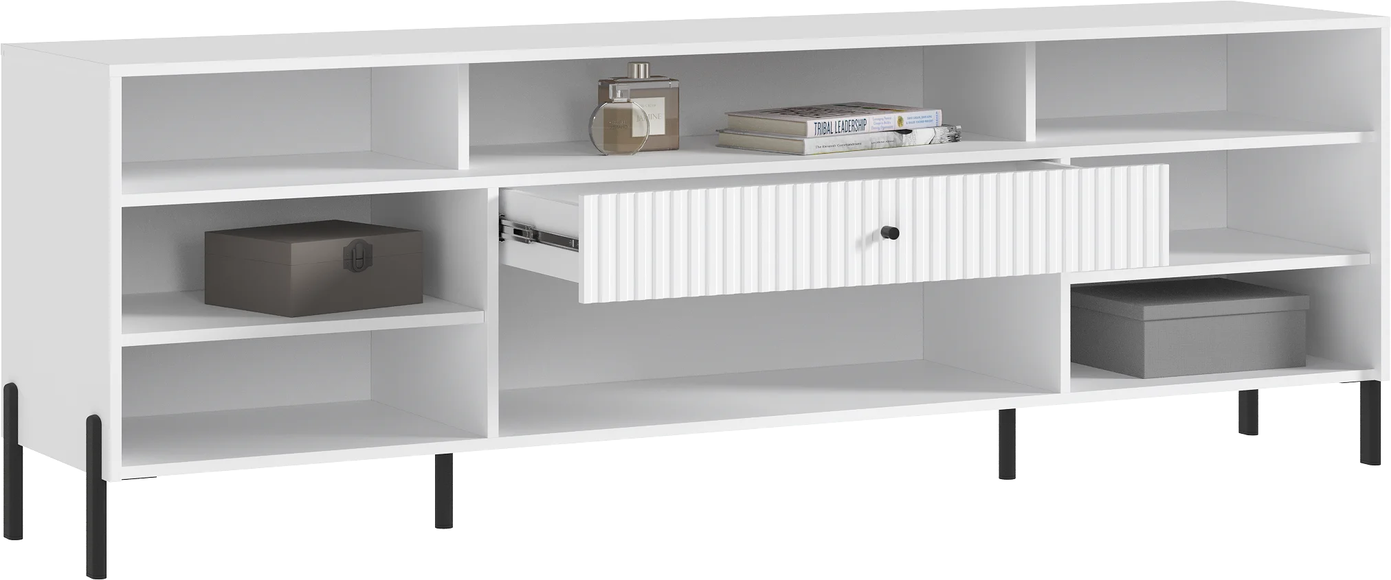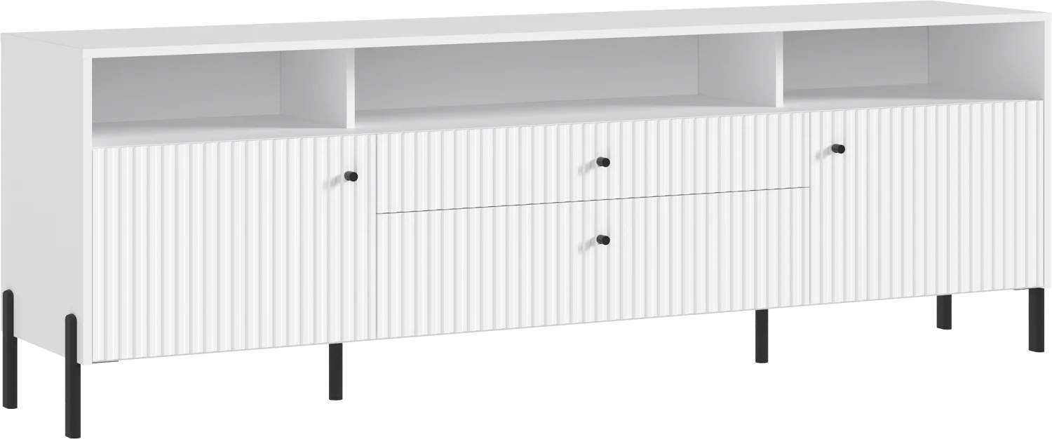 Тумба под телевизор с фрезерованными фасадами и современными шариковыми направляющими обеспечивает легкость в использовании и долговечность.