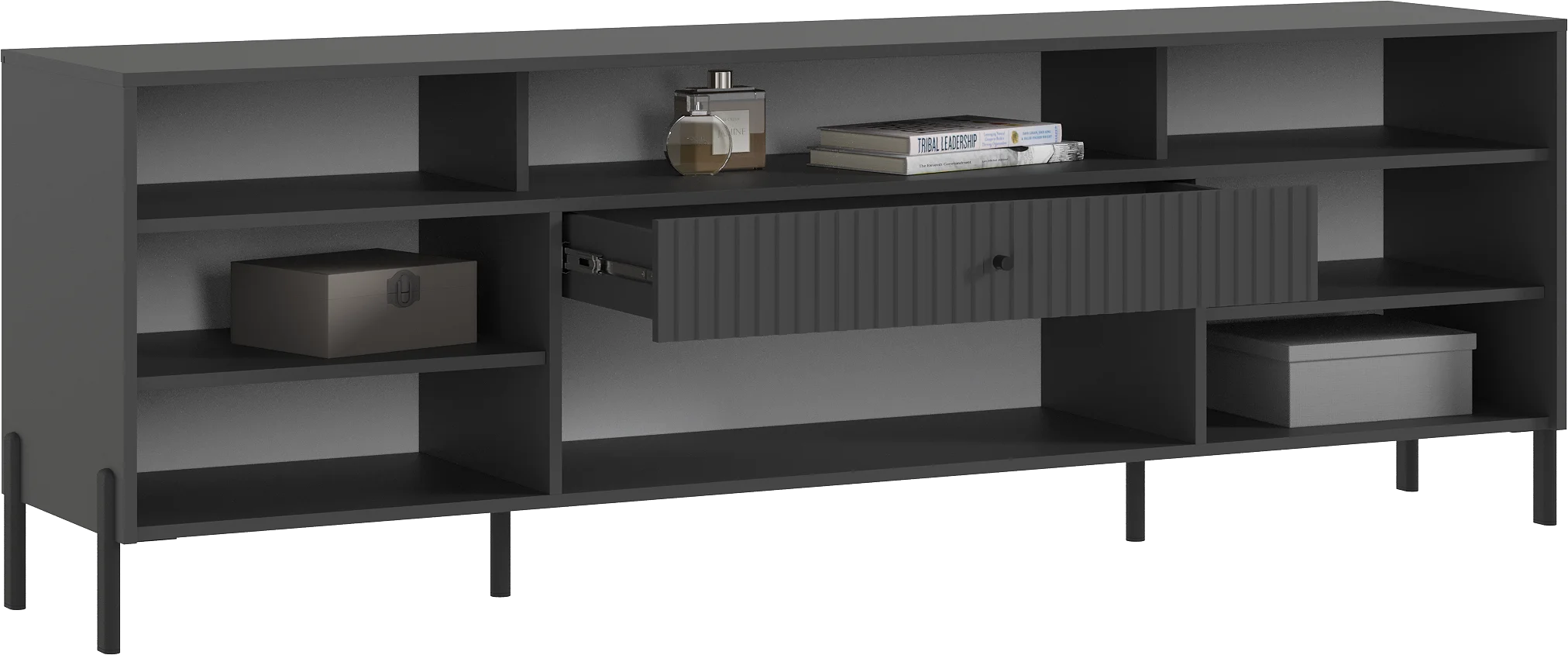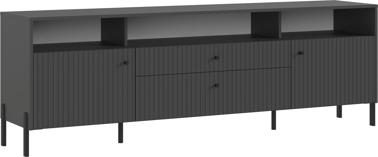 Тумба под телевизор с фрезерованными фасадами и современными шариковыми направляющими обеспечивает легкость в использовании и долговечность.