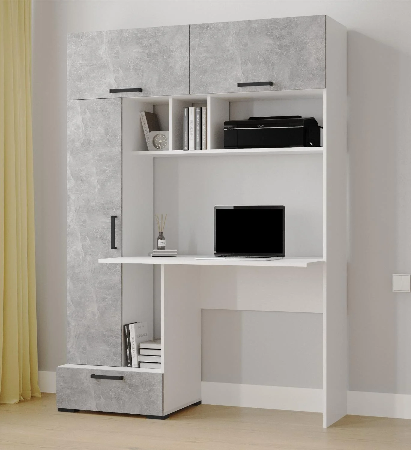 Высота столешницы: 69,8 см. Размер ниши для монитора: 102,6 х 69 см. Цвет белый/ателье светлое.