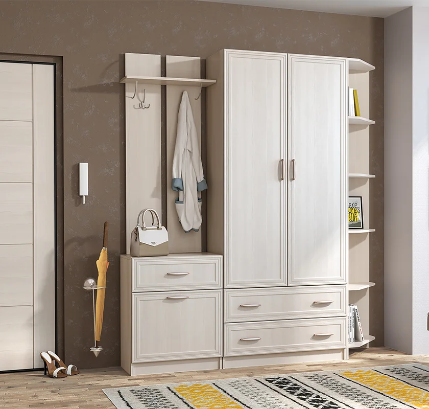 В набор прихожей входят несколько функциональных элементов. Вешалка с антресольной полкой для головных уборов и двумя трёхрожковыми крючками для одежды, объединённая с обувницей, которая включает выдвижной ящик и нишу с откидной створкой. Размеры этого модуля — 600х2100х390 мм.