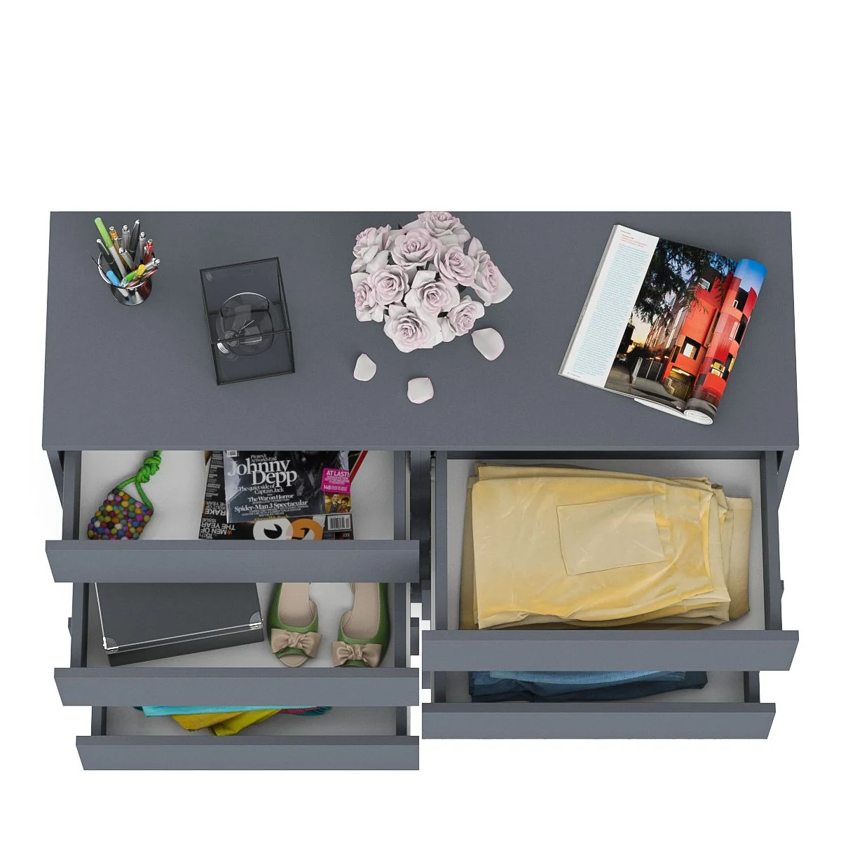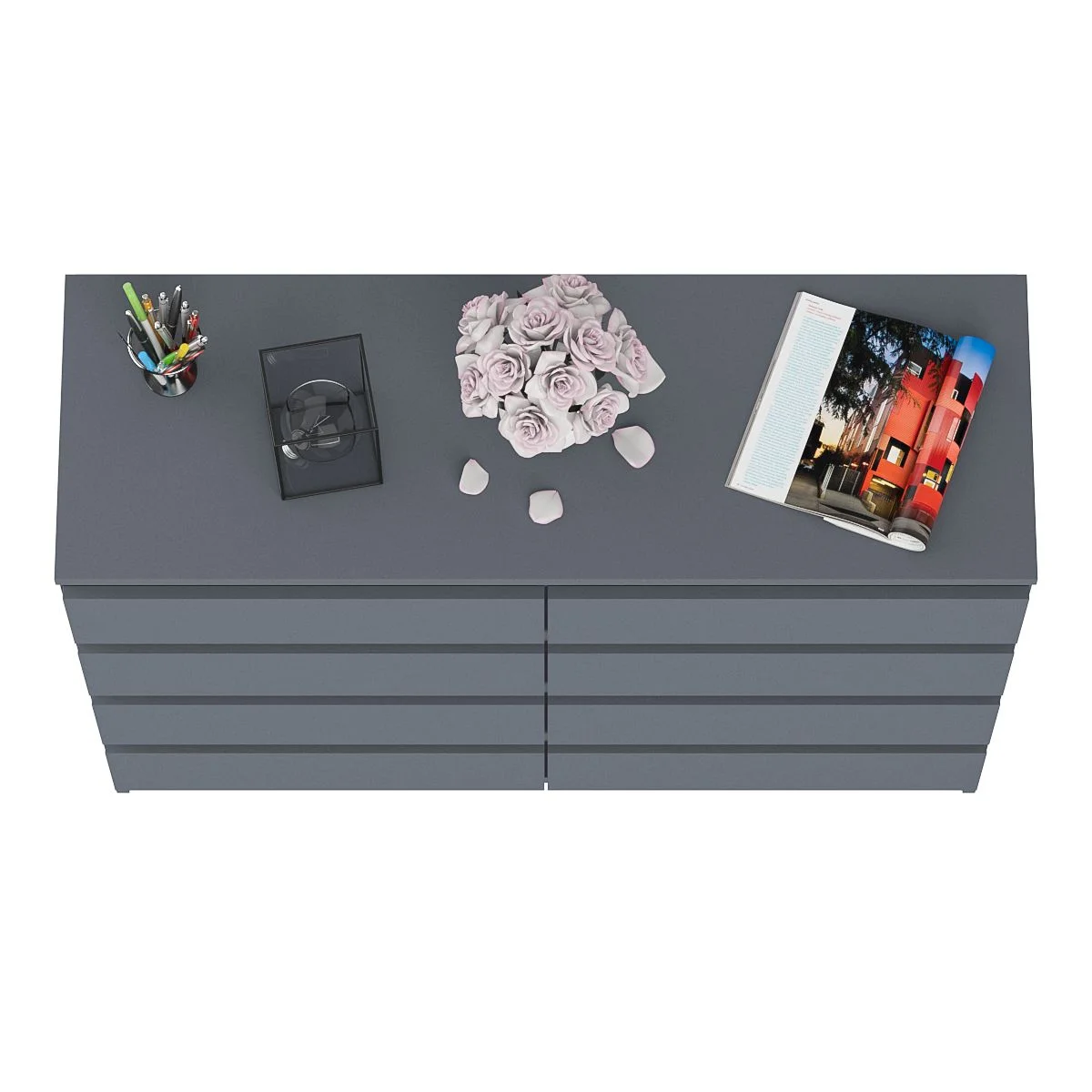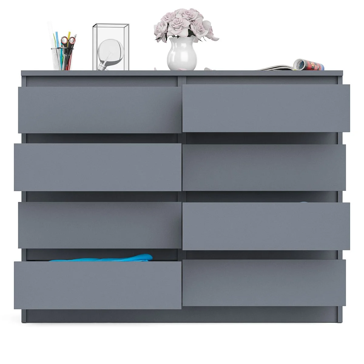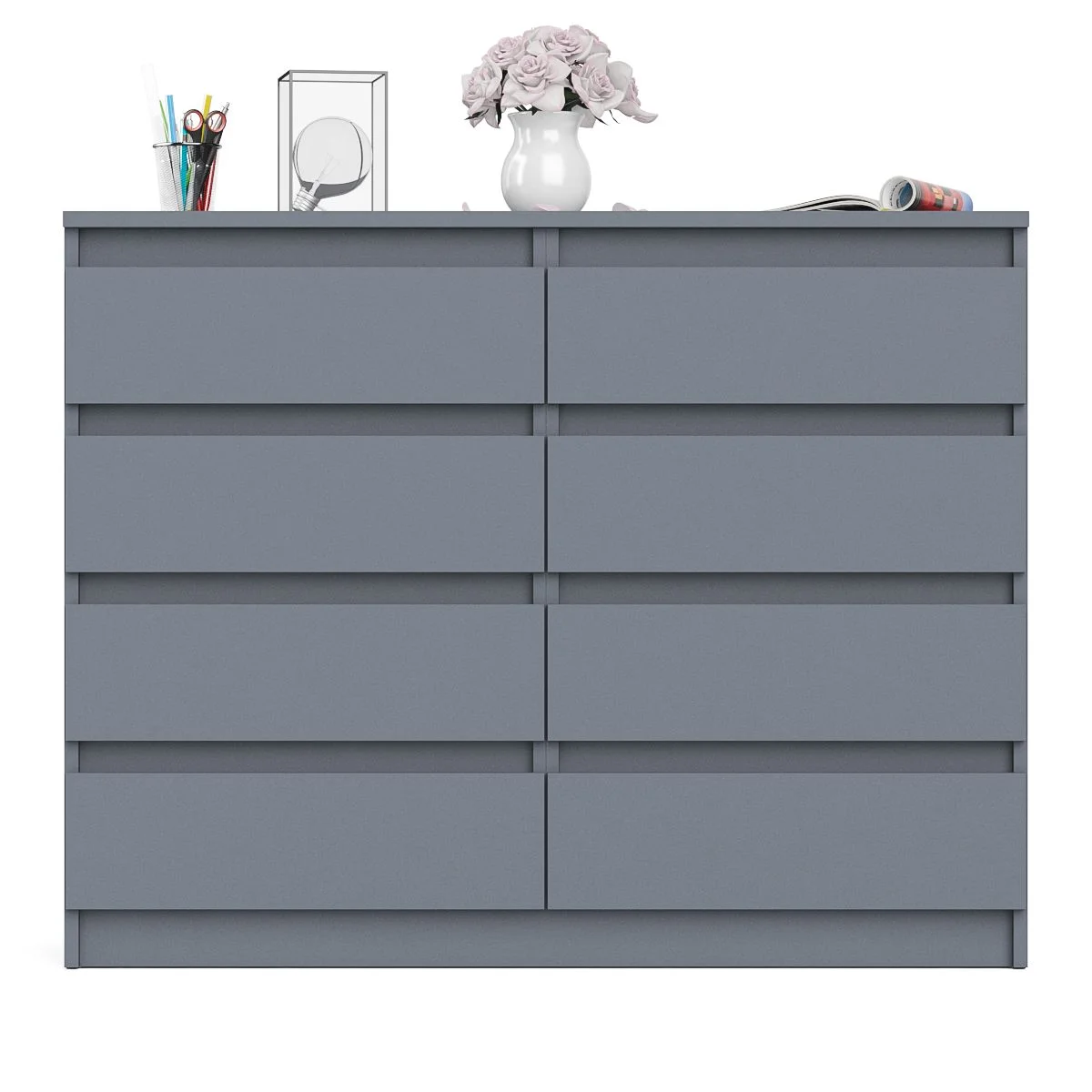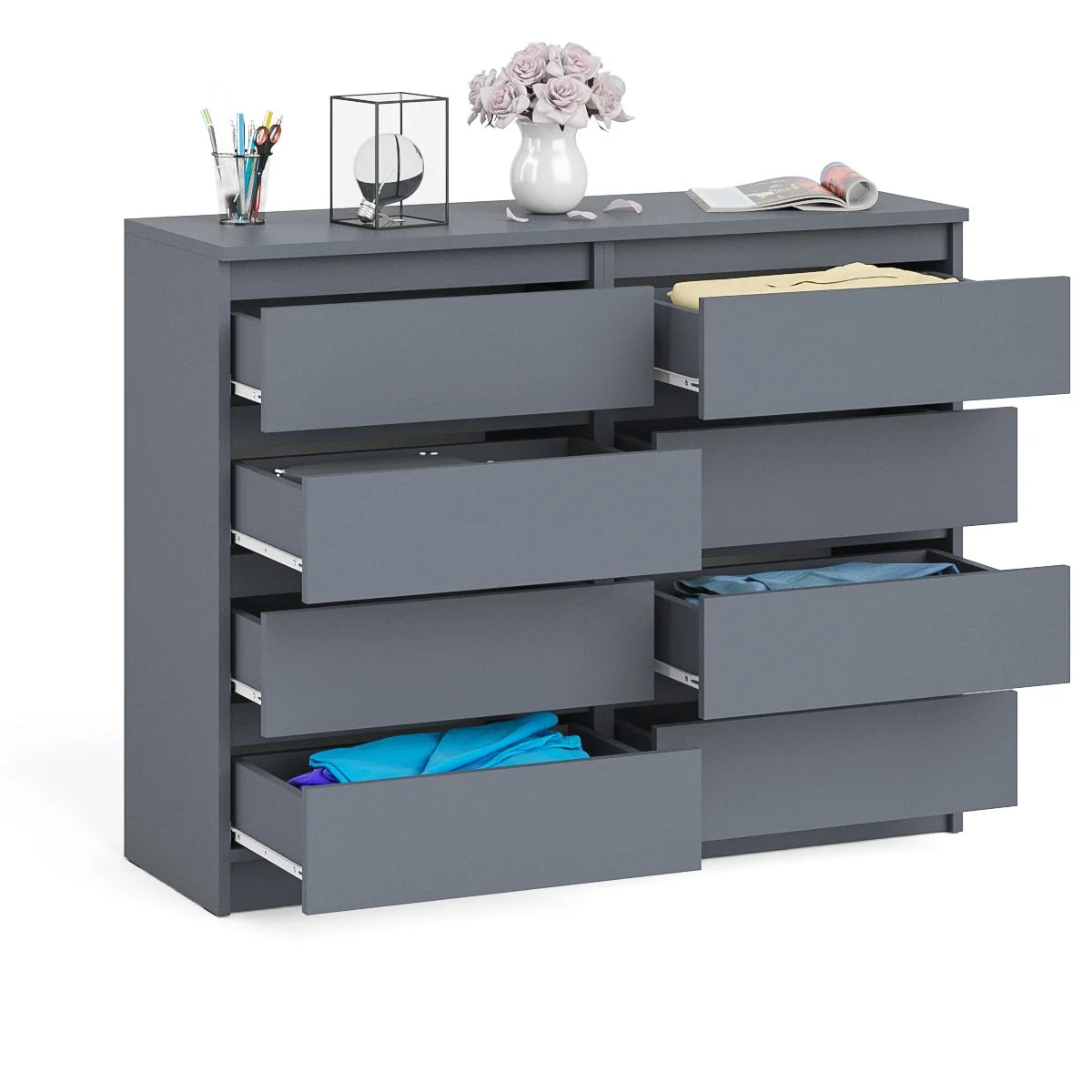 Комод оснащен восемью выдвижными ящиками на роликовых направляющих, что обеспечивает плавное и бесшумное открывание и закрывание. Максимальная нагрузка на каждый ящик составляет 5 кг, что позволяет хранить в них различные предметы. Цветовое решение - графит, что делает комод стильным и современным элементом интерьера. Матовая поверхность и отсутствие ручек придают комоду современный и лаконичный вид.