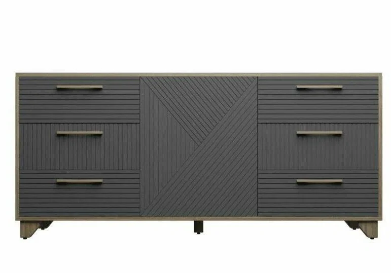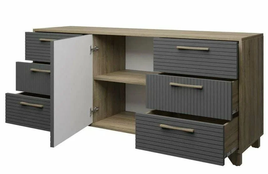 Модель оснащена шестью выдвижными ящиками на шариковых направляющих полного выдвижения. Это обеспечивает удобство использования и позволяет хранить большое количество вещей. Между ящиками за створкой располагается ниша с двумя полками, что добавляет функциональности комоду.