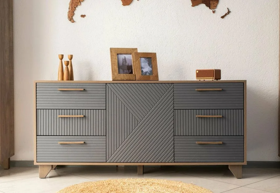 Комод устанавливается на ножки из массива дерева, которые регулируются по высоте. Это позволяет адаптировать комод под любой интерьер и обеспечить устойчивость на неровных поверхностях.
