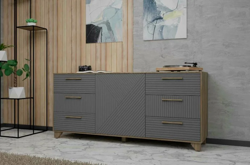 Корпус и фасад комода выполнены из ЛДСП и МДФ соответственно. Покрытие фасада выполнено из премиальной пленки ПВХ Praim, что придает ему матовую поверхность и защищает от повреждений.