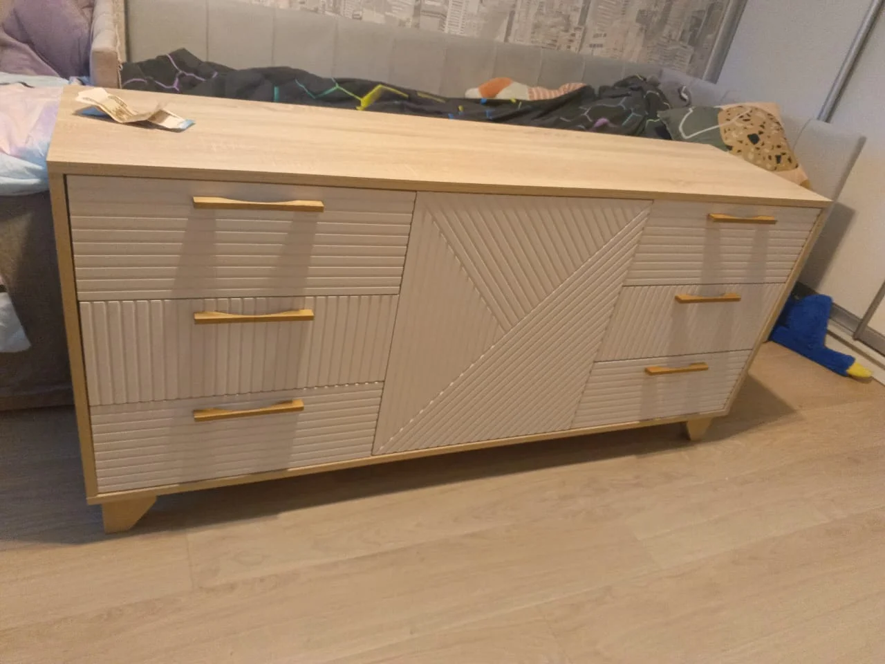Размеры комода составляют 150 см в ширину, 40 см в глубину и 70 см в высоту. Вес изделия – 51,4 кг.