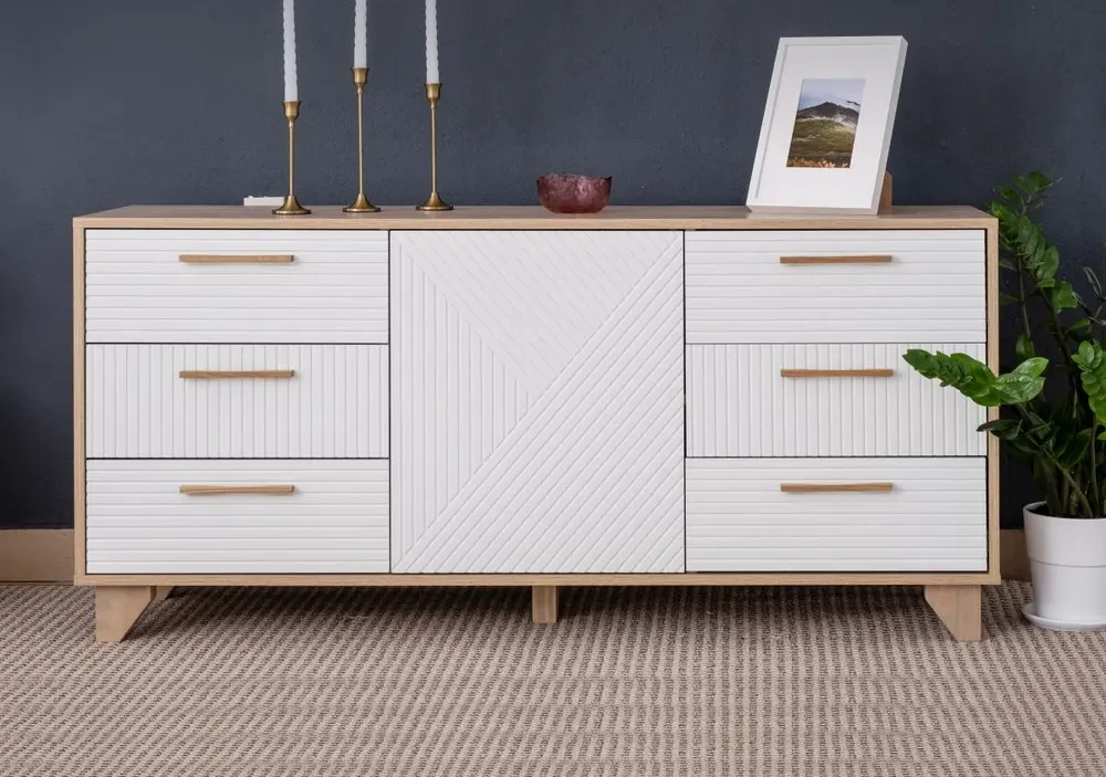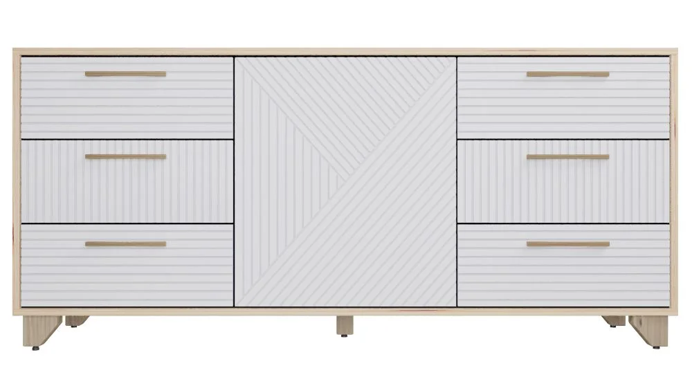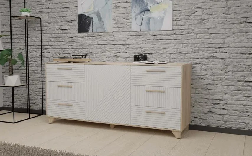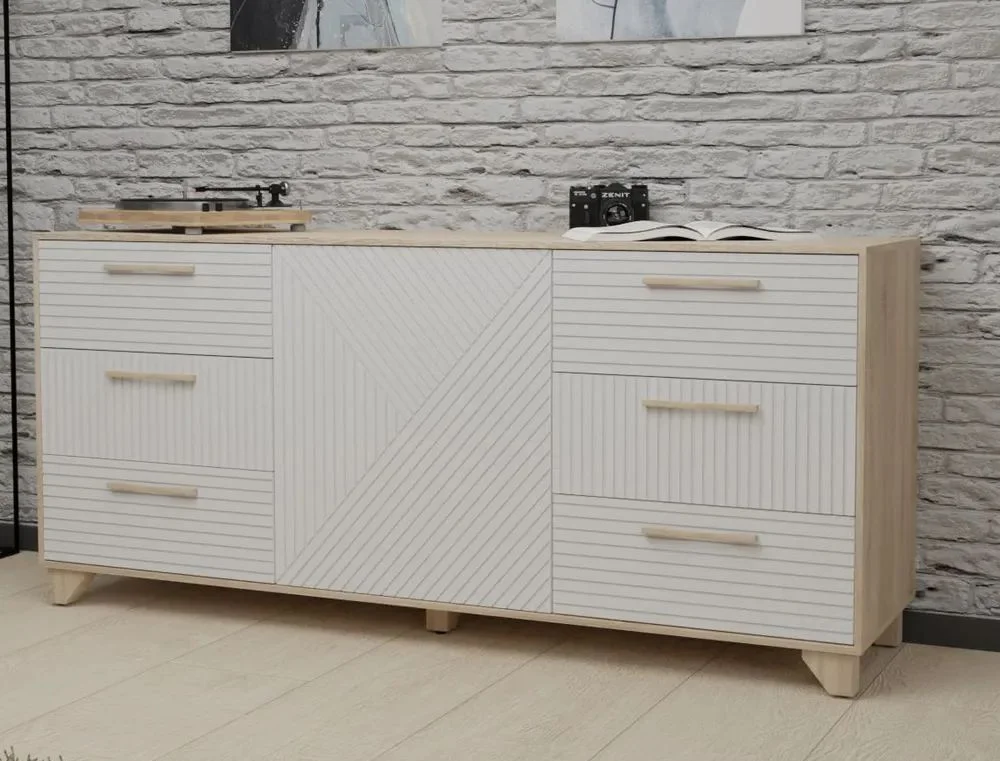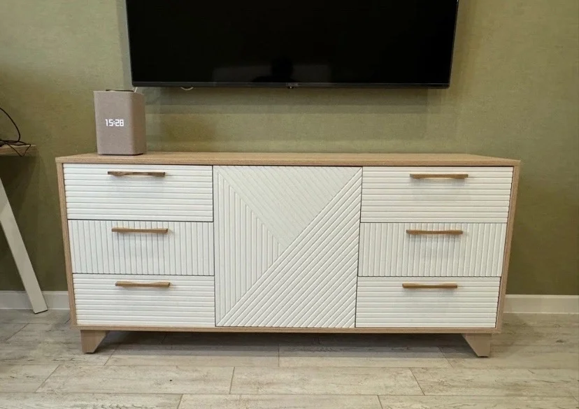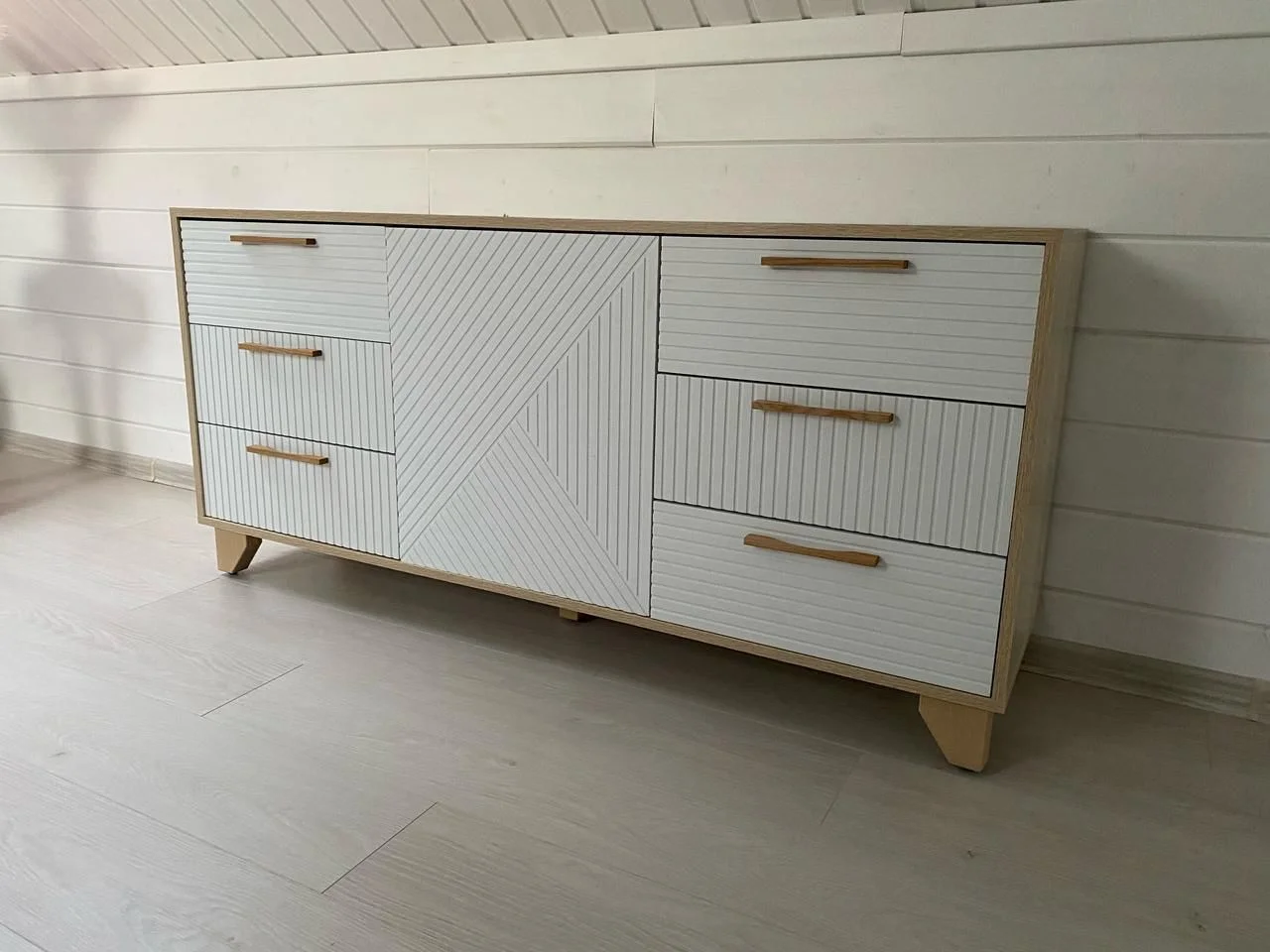 Корпус и фасад комода изготовлены из ЛДСП и МДФ соответственно. Это гарантирует прочность и долговечность изделия.