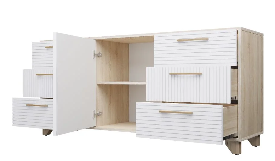 Модель оснащена шестью выдвижными ящиками на шариковых направляющих полного выдвижения. Это обеспечивает удобство использования и позволяет хранить различные предметы. Между ящиками за створкой располагается ниша с двумя полками, что добавляет практичности.