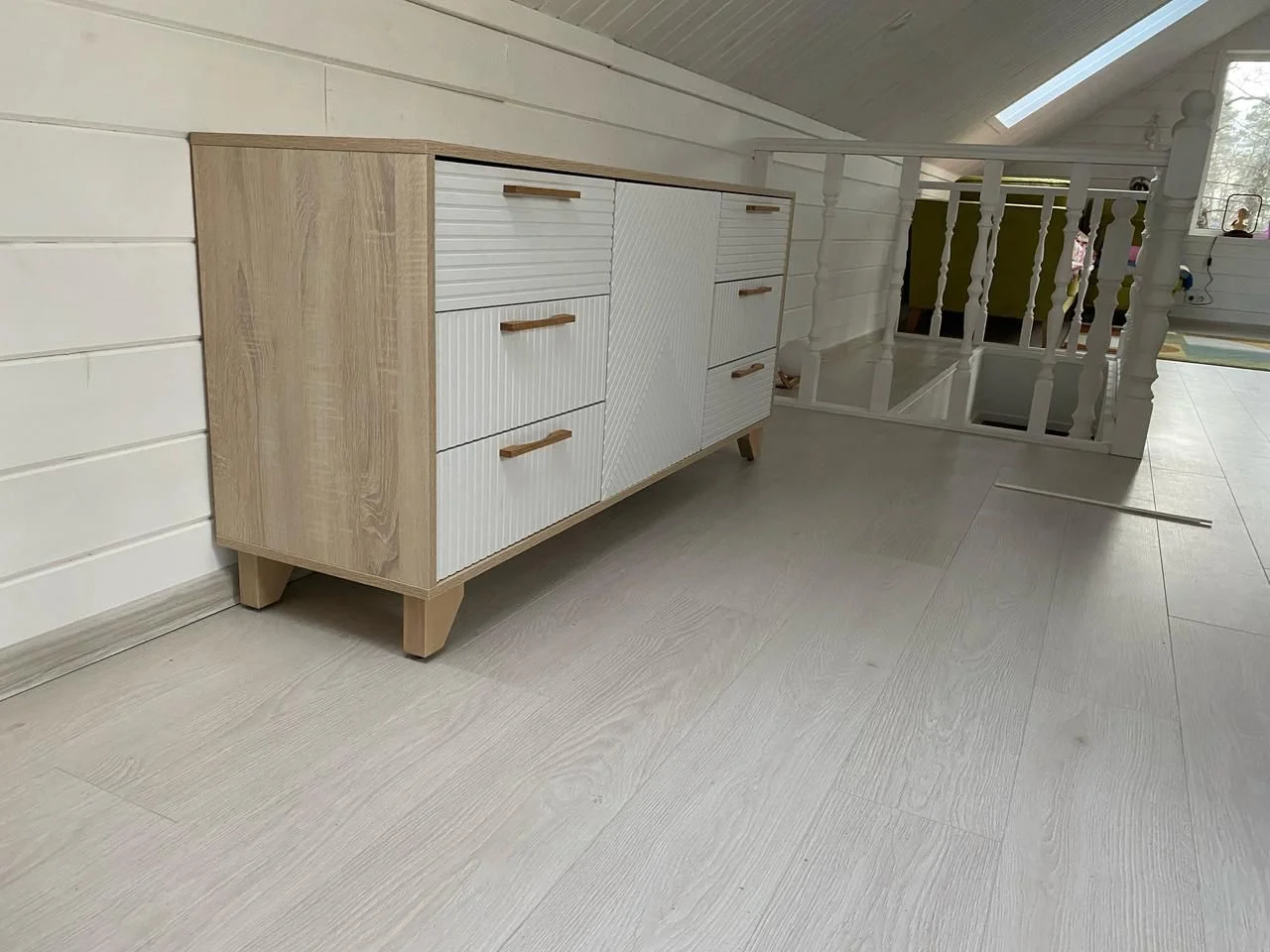 Комод устанавливается на ножки из массива дерева, которые регулируются по высоте. Это позволяет адаптировать комод под любой интерьер и обеспечивает устойчивость на полу.