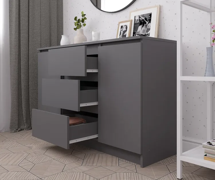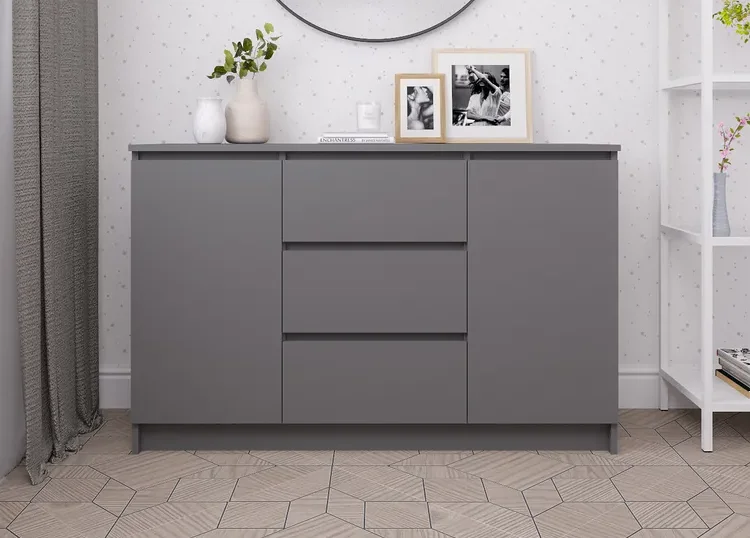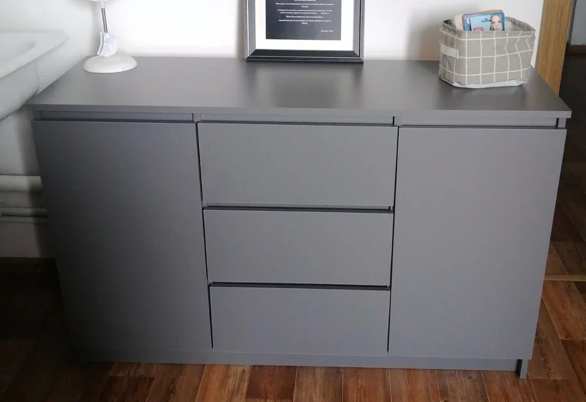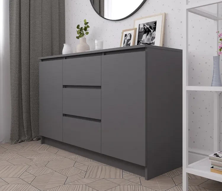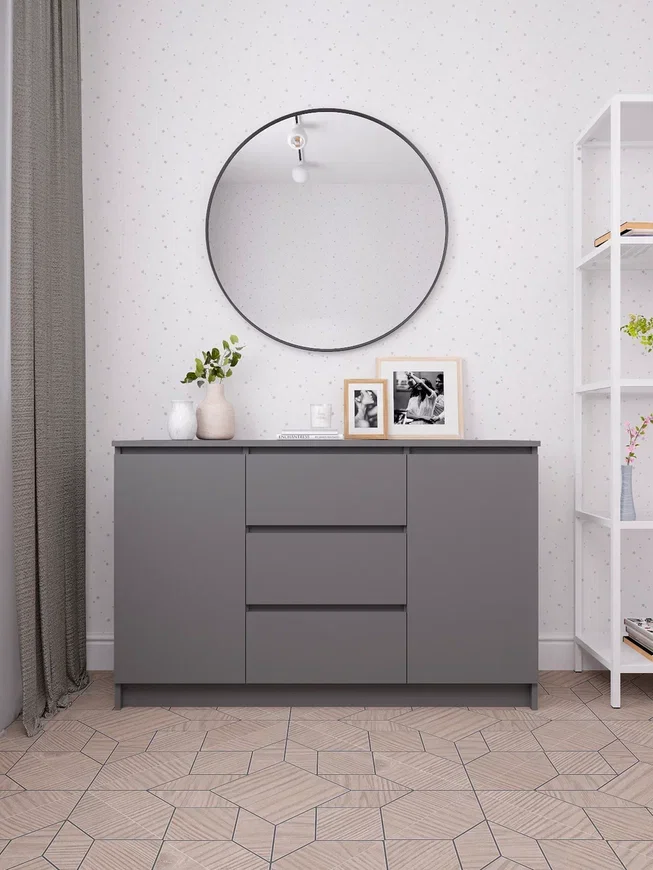 Комод выполнен в скандинавском стиле, который характеризуется простотой и минимализмом. Матовый серый цвет фасада и корпуса из ЛДСП придает изделию современный и элегантный вид.