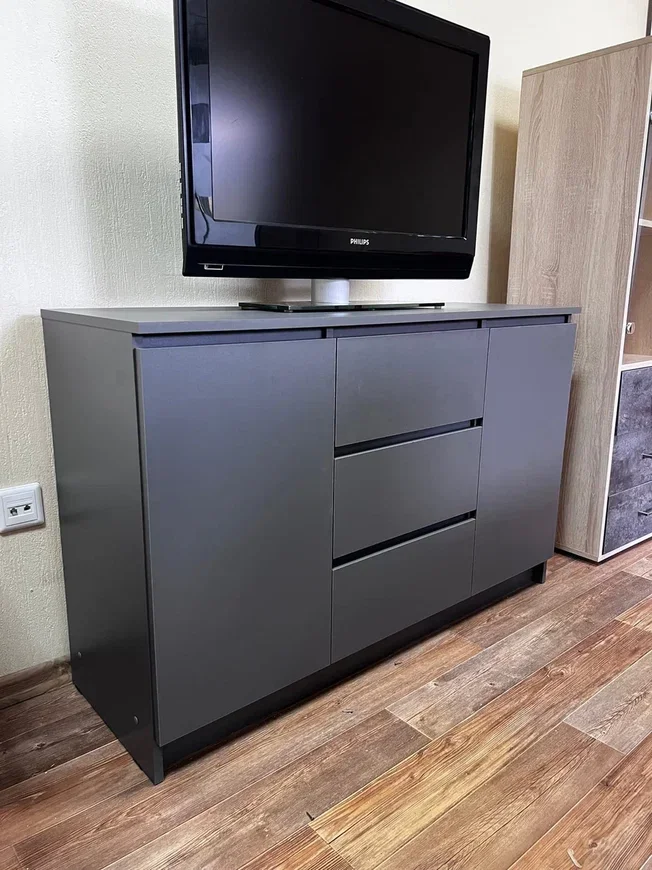 Комод оборудован тремя выдвижными ящиками и двумя отделениями с дверками и полками в каждом. Максимальная нагрузка на ящик составляет 3 кг, а на комод в целом - 15 кг.