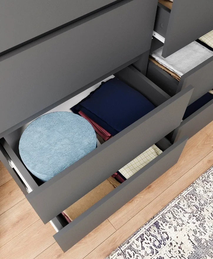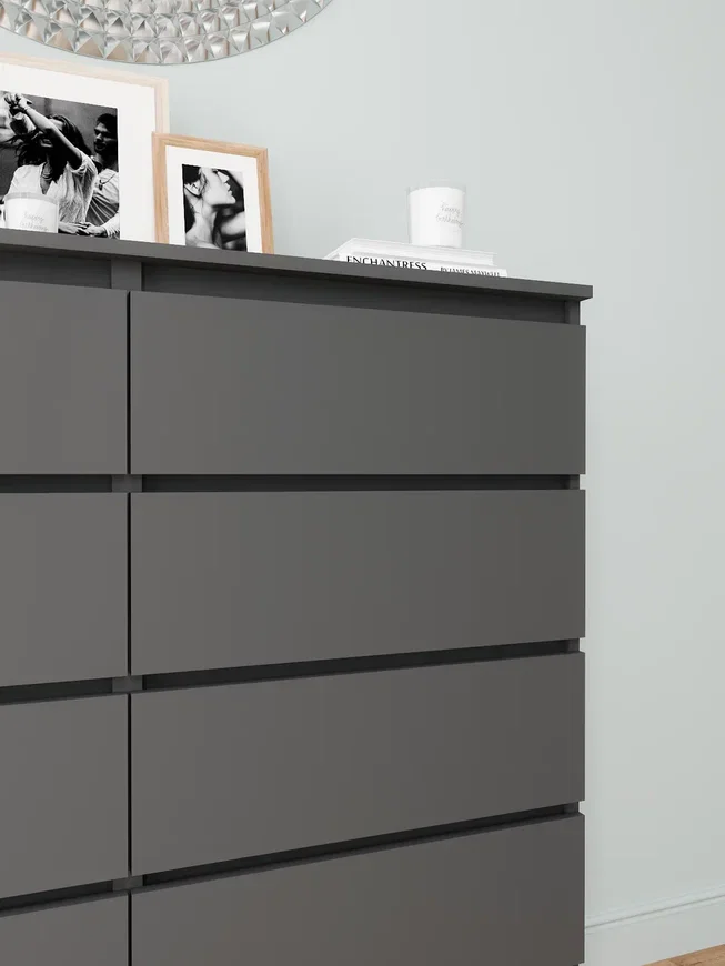 Комод выполнен в графитовом цвете ЛДСП, который придает ему современный и стильный вид. Матовая поверхность корпуса и фасада обеспечивает долговечность и устойчивость к царапинам.