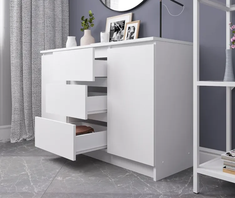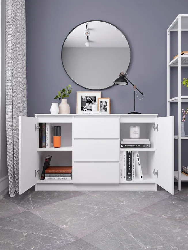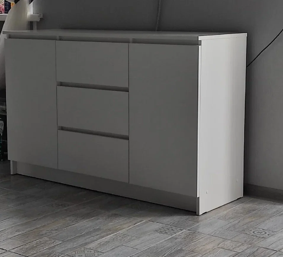 Комод оснащен тремя ящиками на роликовых направляющих, что обеспечивает плавное и бесшумное открывание. На фасадах ящиков отсутствуют ручки, что придает комоду современный и стильный вид.