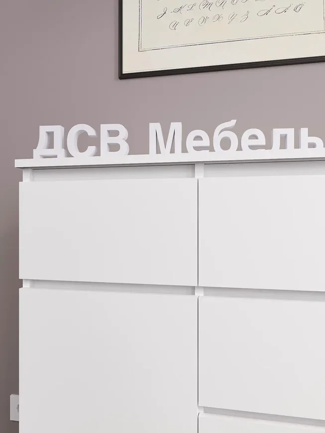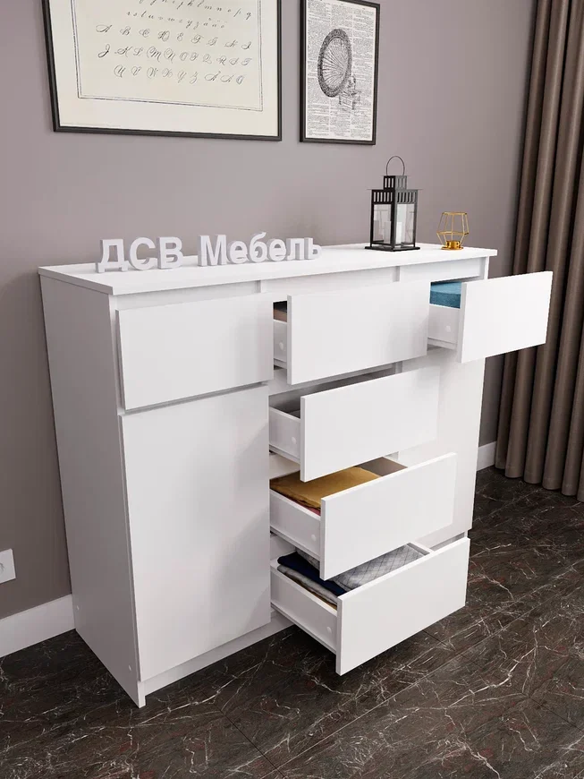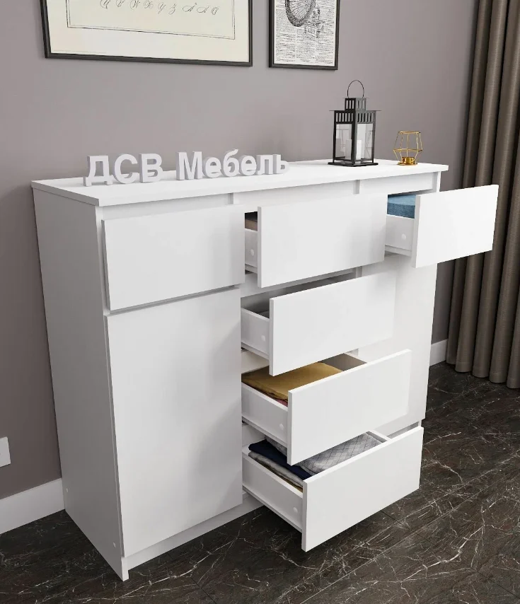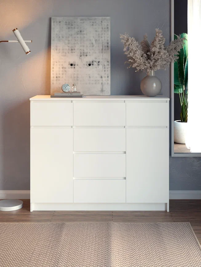 Комод оснащен 6 удобными выдвижными ящиками и двумя отделениями с дверками, что позволяет хранить большое количество вещей. Благодаря отсутствию ручек на фасадах ящиков, открывание происходит за фасад (верхняя часть с внутренней стороны прямая под углом 90°).