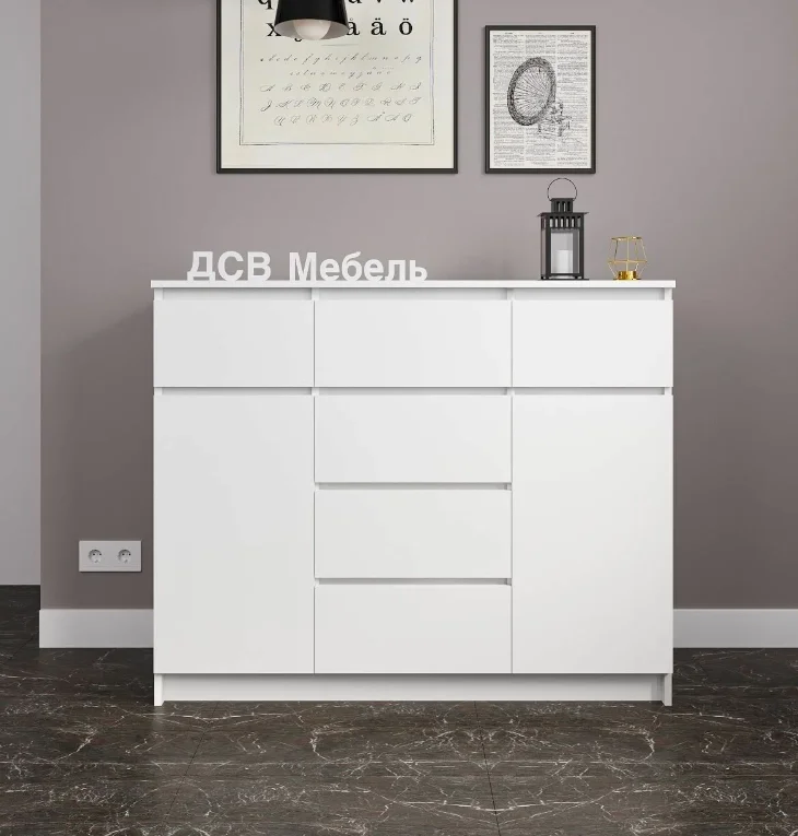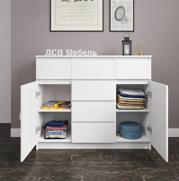 Особенностью комода является модульная конструкция, позволяющая легко менять расположение угла и петель. Максимальная нагрузка на комод составляет 100 кг, что делает его устойчивым и надежным.