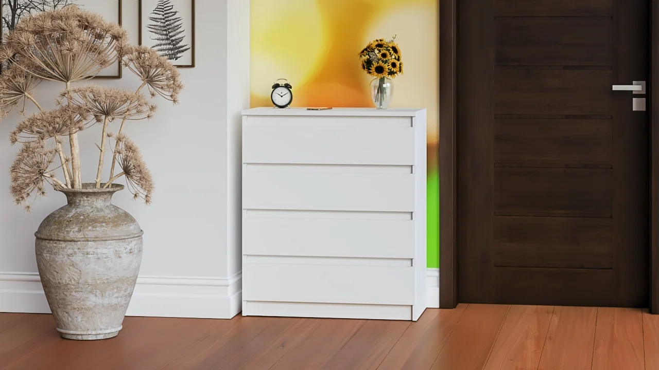 Материал корпуса и фасада комода - ЛДСП толщиной 16 мм. Торцы обработаны ПХВ пленкой толщиной 0,4 мм, что обеспечивает дополнительную защиту от повреждений и износа.