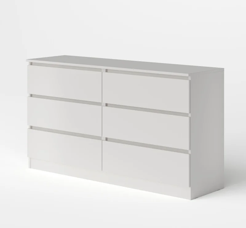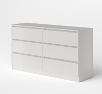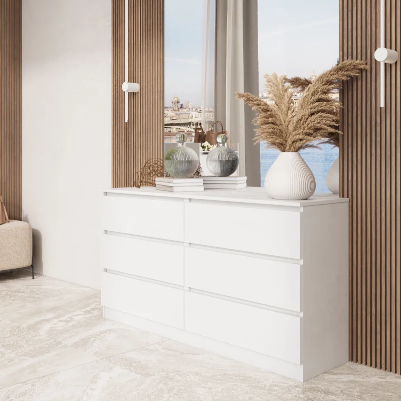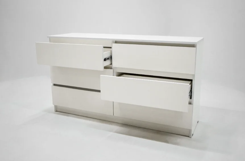 Комод оснащен шестью выдвижными ящиками на шариковых направляющих, максимальная нагрузка на каждый из которых составляет 5 кг. Это позволяет хранить в них различные предметы и вещи, включая одежду, белье и другие аксессуары.
