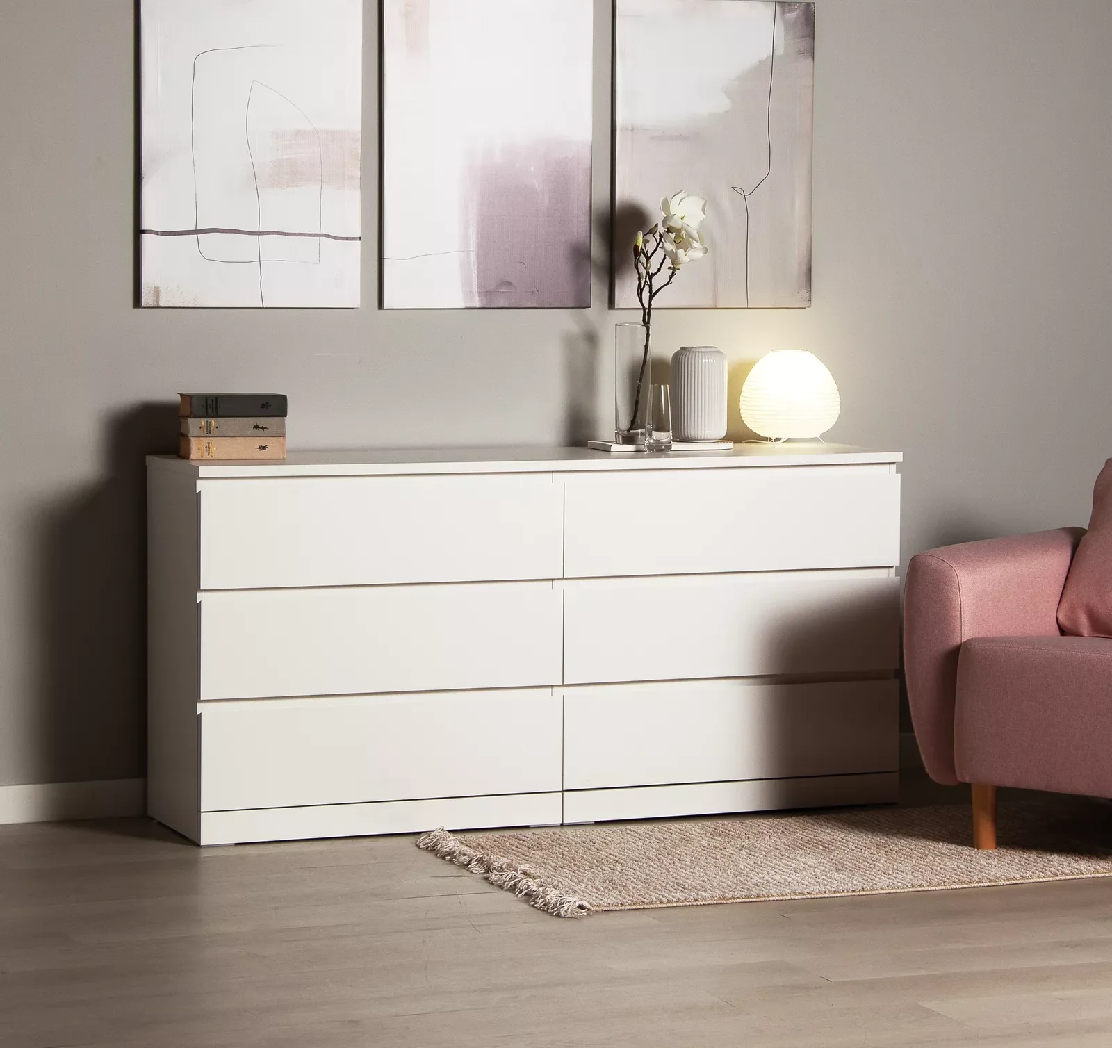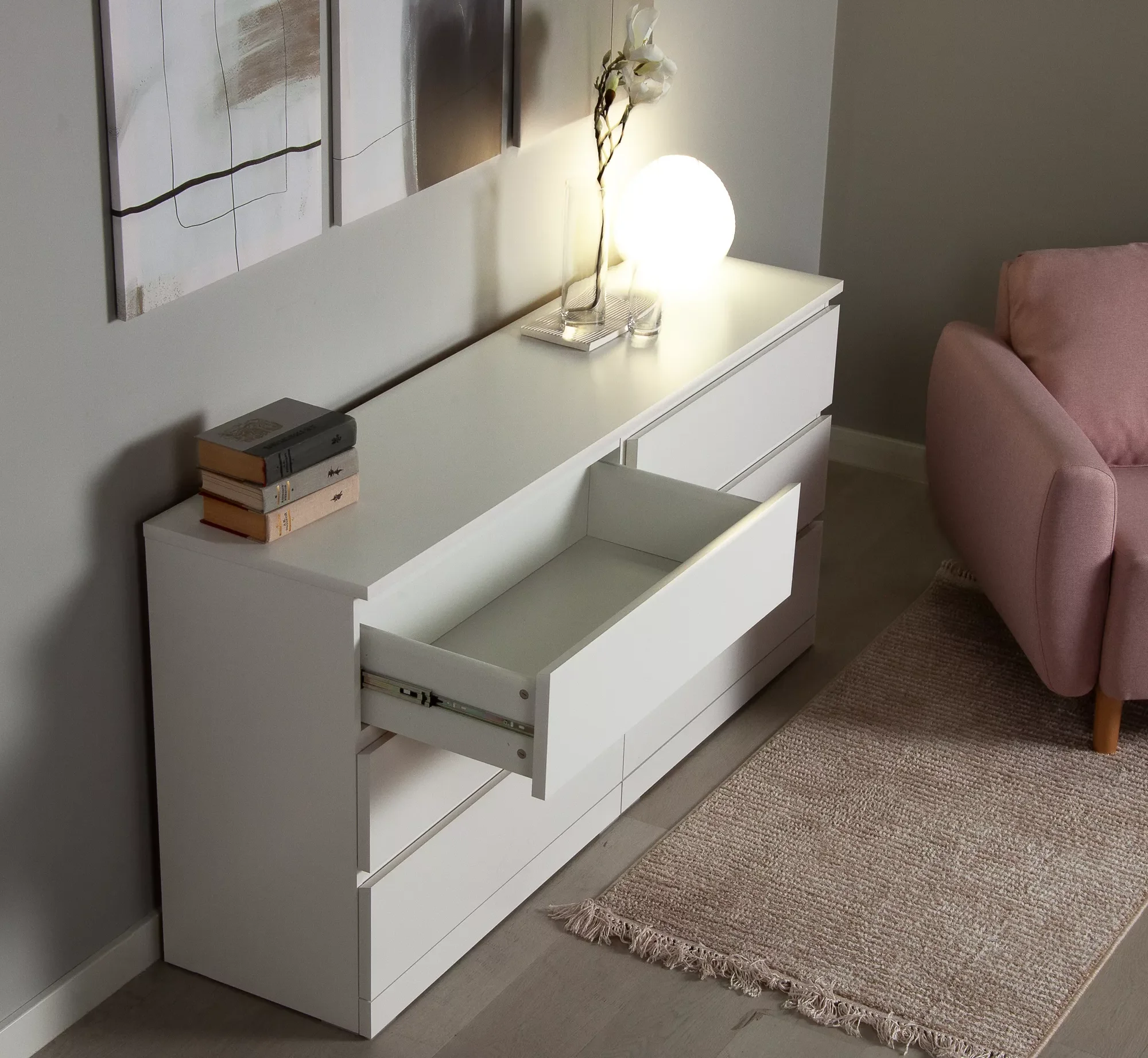 Ящики на шариковых телескопических направляющих полного выдвижения европейского производства, фирма GTV, рассчитаны на нагрузку до 8 кг, высота направляющих 35 мм, без доводчиков. Корпус ящиков: ЛДСП. Пластиковые ножки высотой 5 мм. Цветовое решение белый.