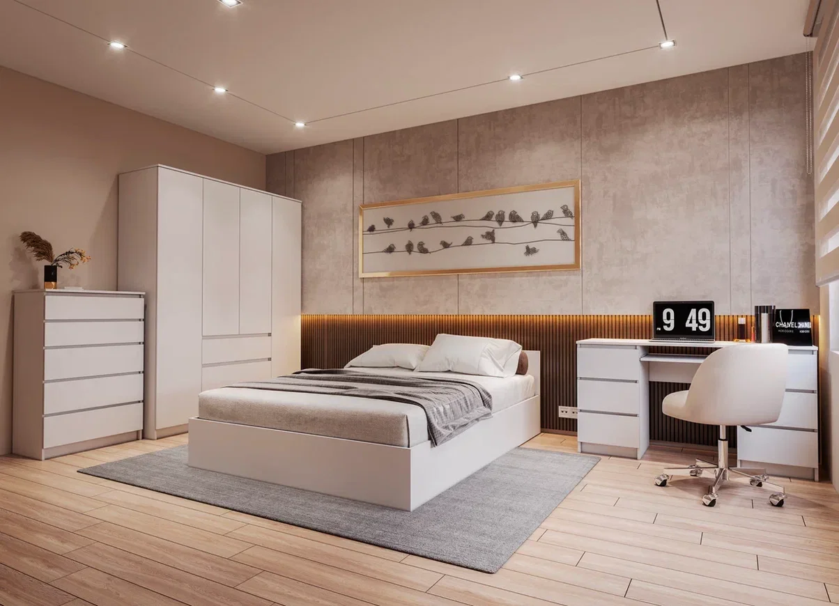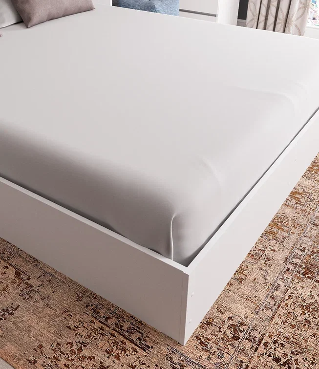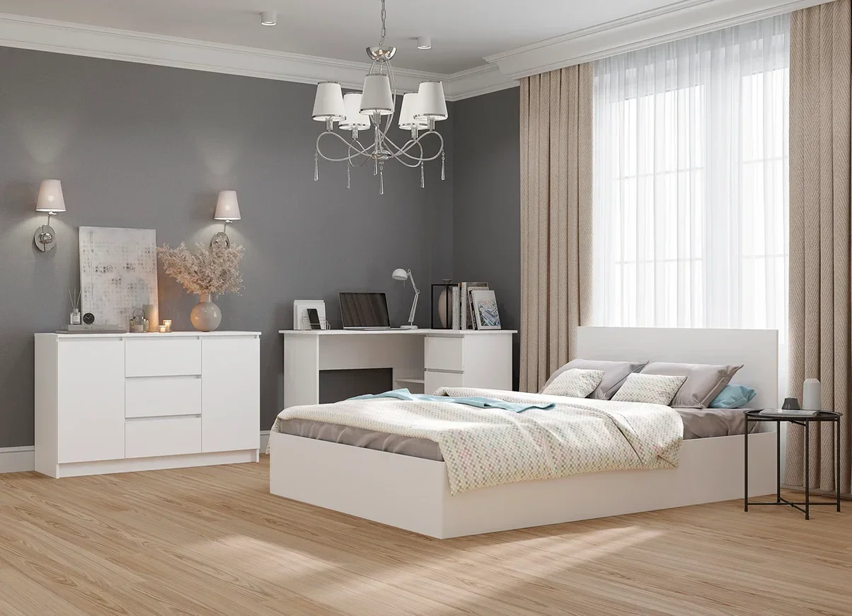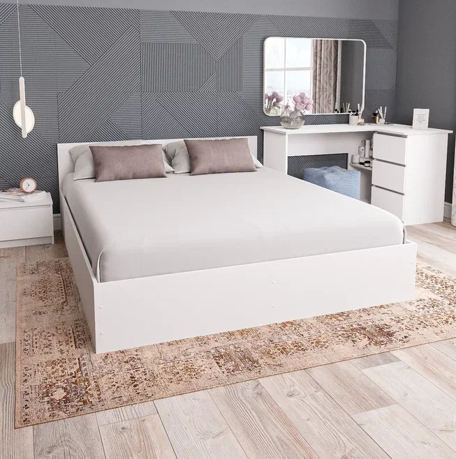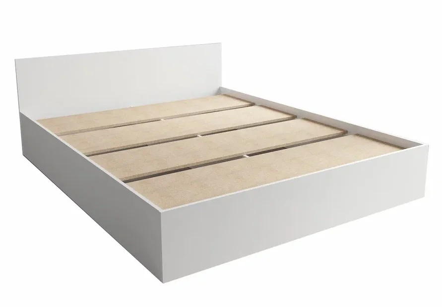 Кровать изготовлена из качественного ЛДСП, что гарантирует прочность и долговечность конструкции. Основание кровати выполнено в виде настила из ЛДСП, что обеспечивает жесткость и стабильность спального места.