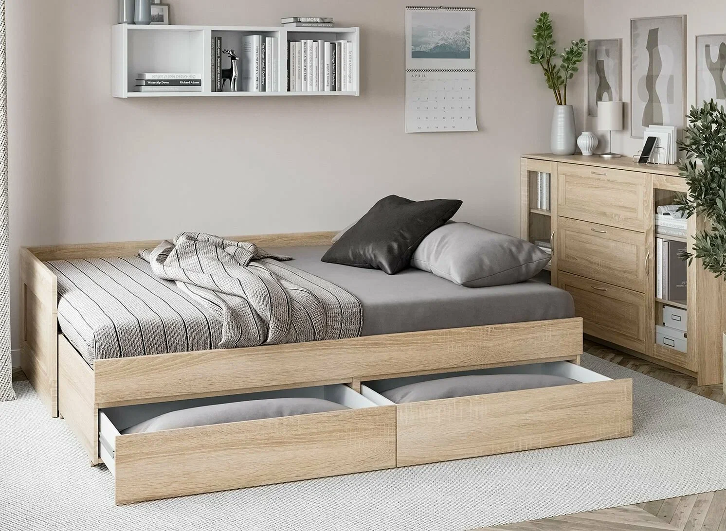 Рекомендуем приобретать 2 матраса, размером 90 х 200, высотой 8-11см (высота от реечного основания до бокового бортика 22 см).