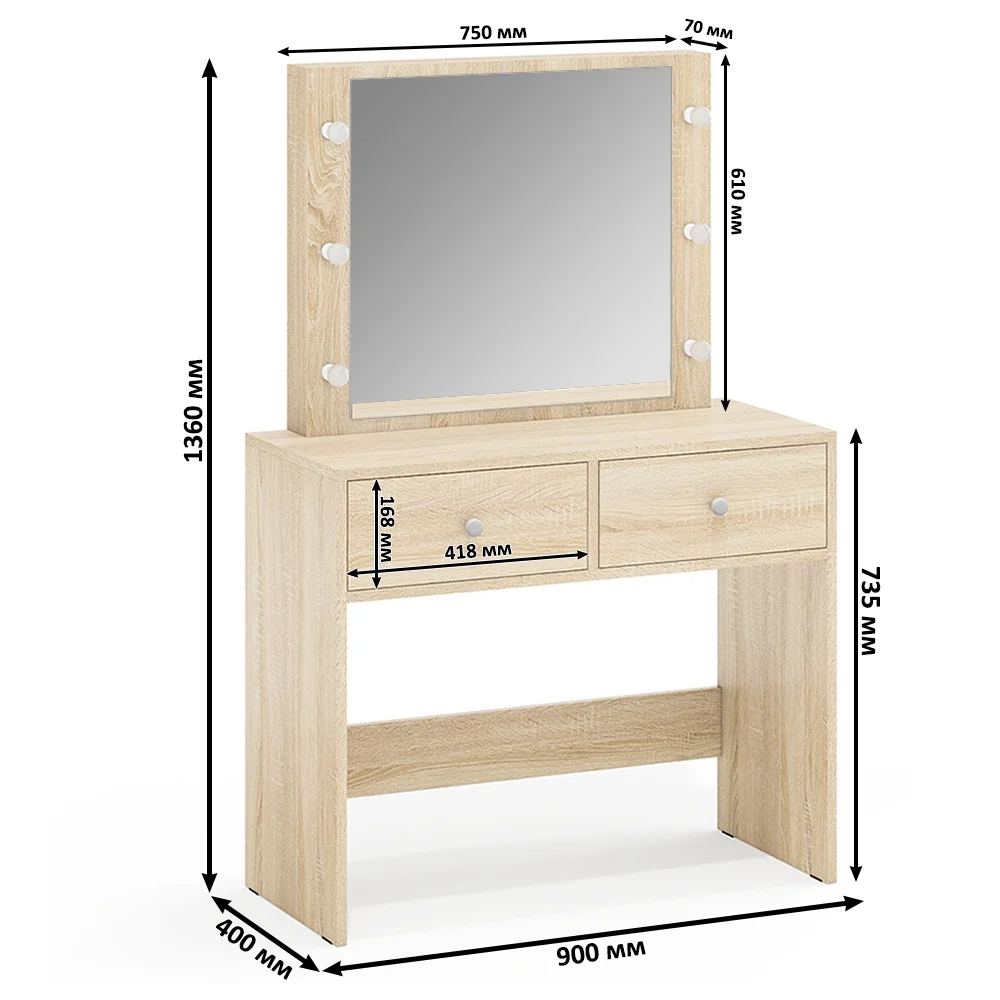 Габаритные размеры стола туалетного (ШхГхВ): 90 х 40 х 136 см.