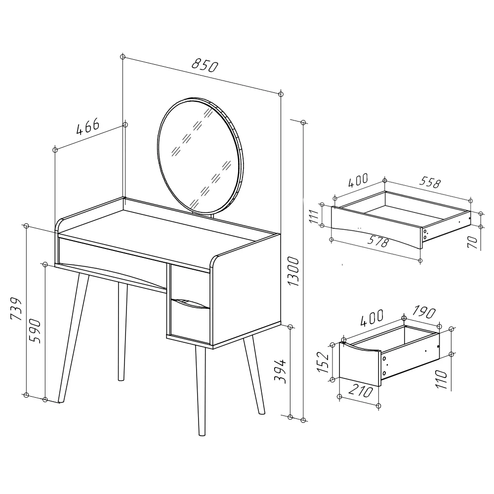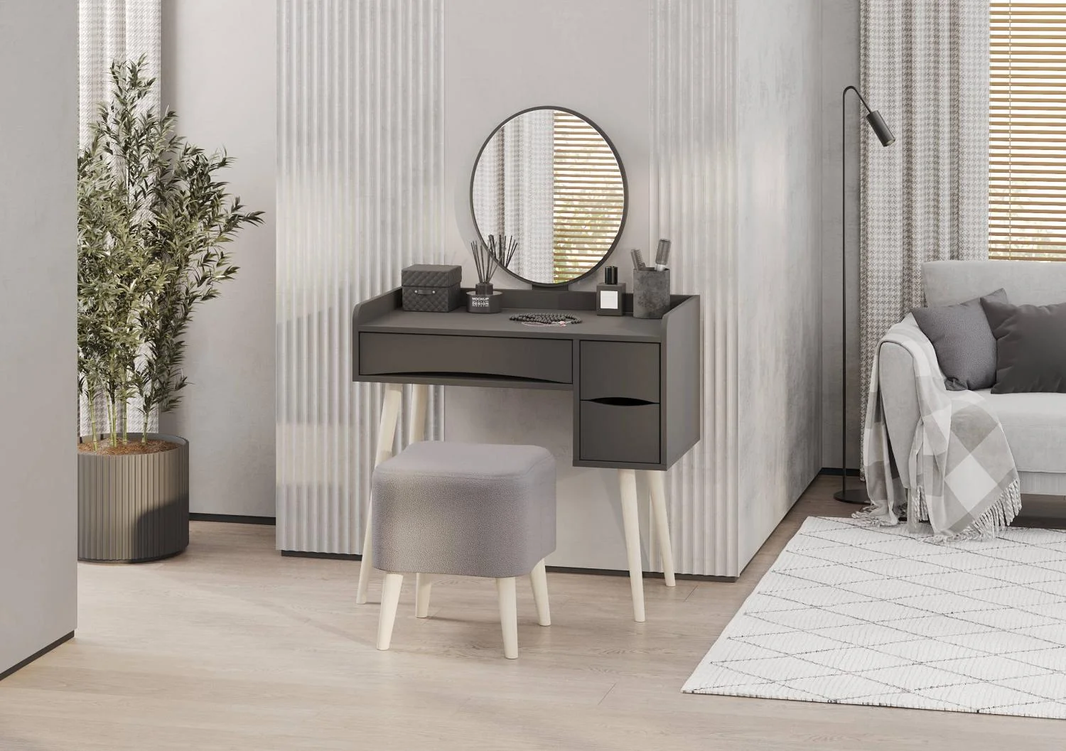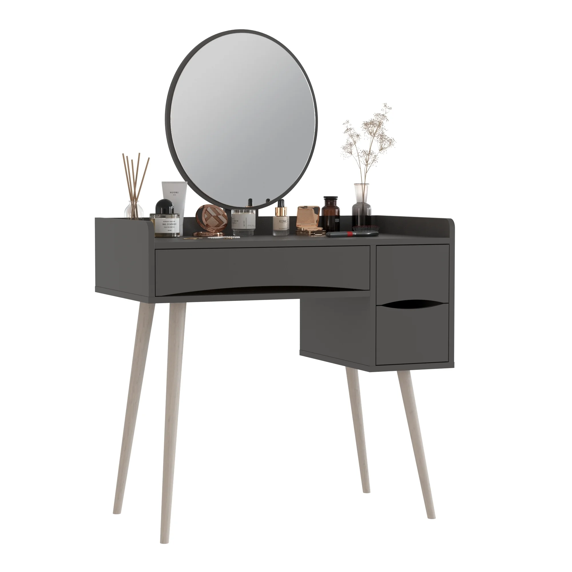 Ящики столика открываются за край фасадов, что обеспечивает удобный доступ. Такой столик станет прекрасным дополнением к интерьеру и поможет организовать хранение мелочей. Цвет графит придаёт столику современный и универсальный вид, который легко впишется в разные стили оформления. Трюмо сочетает в себе функциональность и эстетику, делая его популярным выбором для многих.