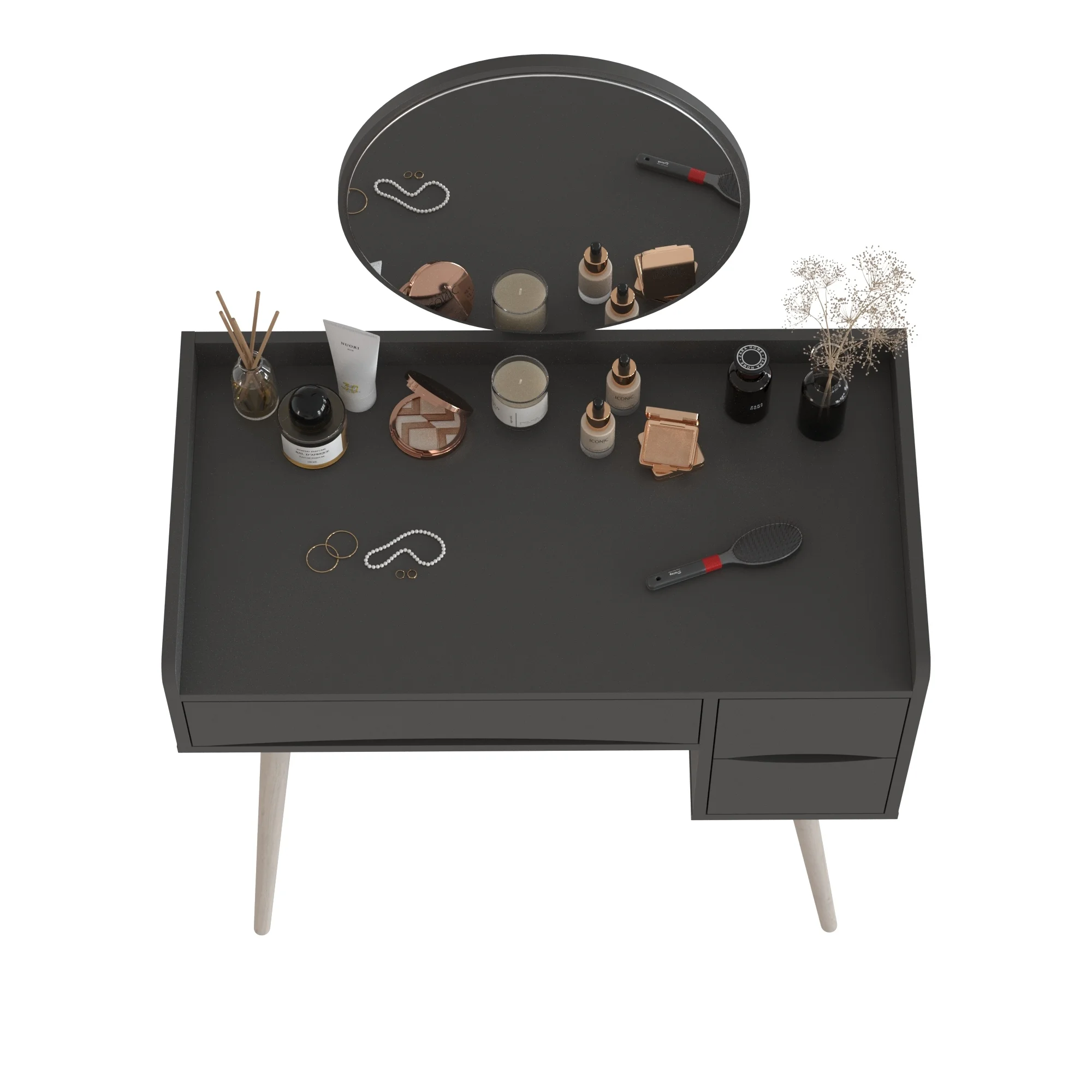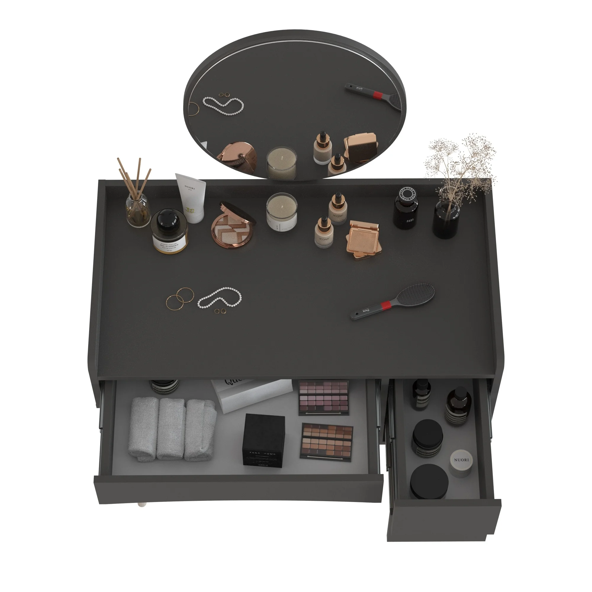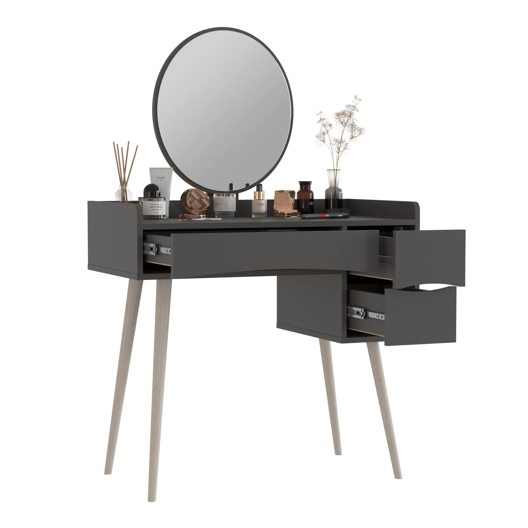 Ящики столика открываются за край фасадов, что обеспечивает удобный доступ. Такой столик станет прекрасным дополнением к интерьеру и поможет организовать хранение мелочей. Цвет графит придаёт столику современный и универсальный вид, который легко впишется в разные стили оформления. Трюмо сочетает в себе функциональность и эстетику, делая его популярным выбором для многих.