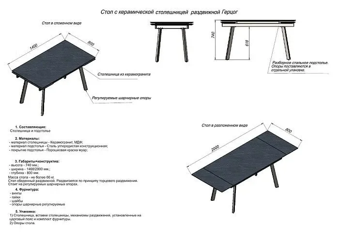 Регулируемые шарнирные опоры позволяют выставить стол по уровню. Механизм раздвижения - Германия. При раздвижении столешницы, рисунок сохраняется остается цельным. Максимальная нагрузка: 80 кг. Размеры: Длина: 1400 мм. Ширина: 800 мм. Высота: 740 мм. В сложенном виде комфортно размещаются до 6 человек, в разложенном до 8 человек. Боковые вставки добавляют по 30 см с каждой стороны.