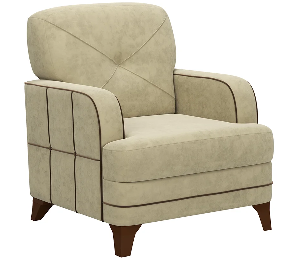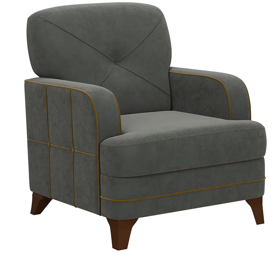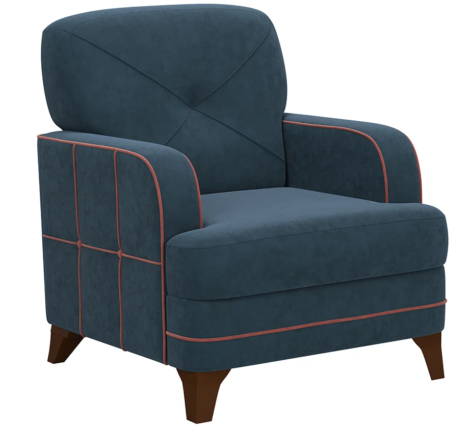 Декоративные канты на вставке подлокотников. Пуговицы в местах пересечения кантов на подушке и вставке подлокотников. По торцам подлокотников и думках контрастный декоративный кант.