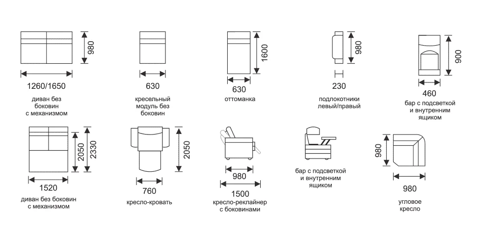 Модули согласно фото и цены: два локтя, диванная часть со спальным местом, оттоманка с нишей для хранения.