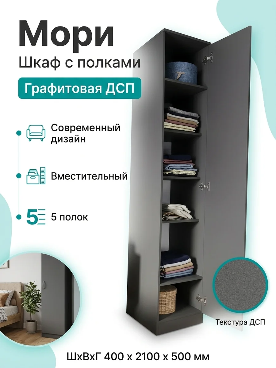 Размеры шкафа составляют 210 см в высоту, 40 см в ширину и 50 см в глубину, что позволяет использовать его в различных помещениях. Установка шкафа напольная, а тип дверей - распашные. Выбирая шкаф Мори МШ 400.1 графит, вы получаете не только стильный и функциональный элемент мебели, но и надежного помощника в организации пространства вашего дома.