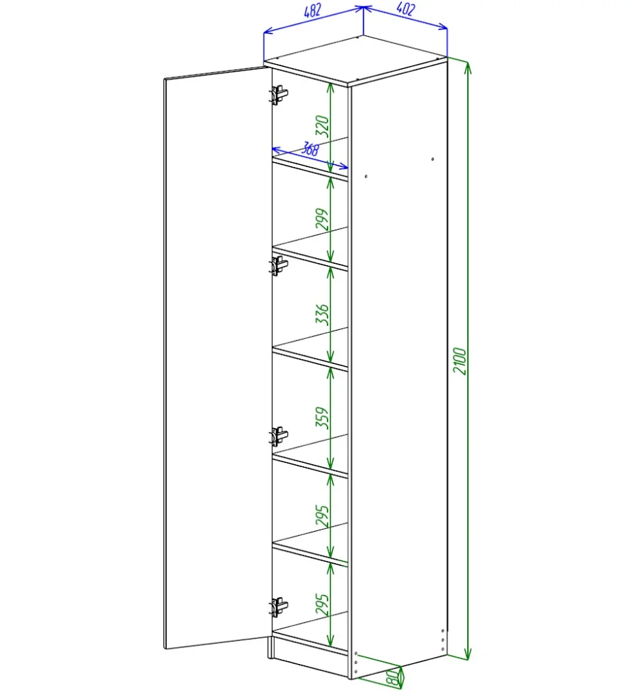 Фурнитура выполнена из прочного пластика, что обеспечивает долгий срок службы и надежность конструкции. Габариты пенала составляют (ШхВхГ) — 402 х 2100 х 482 мм, что позволяет легко подобрать место для его установки.