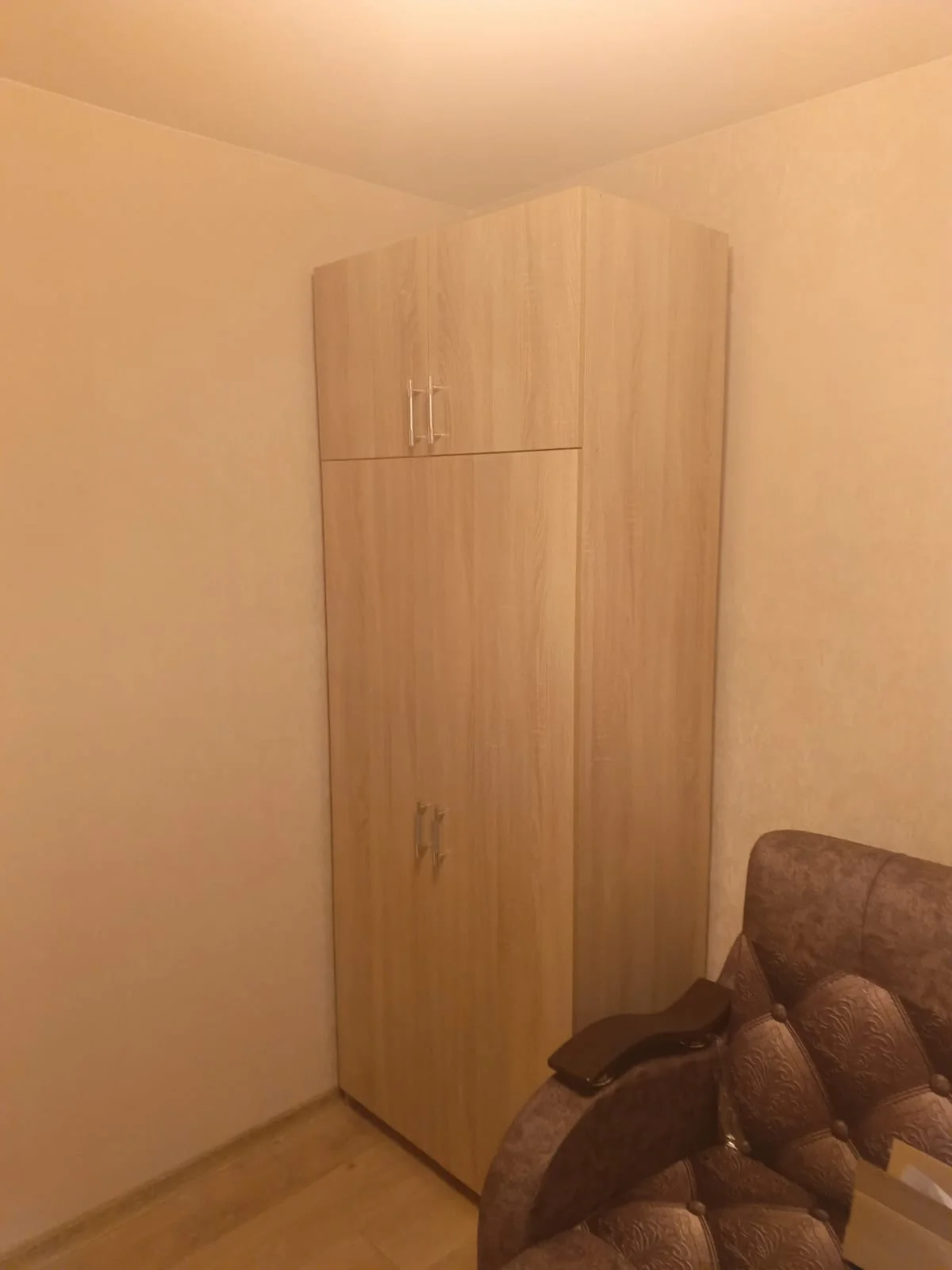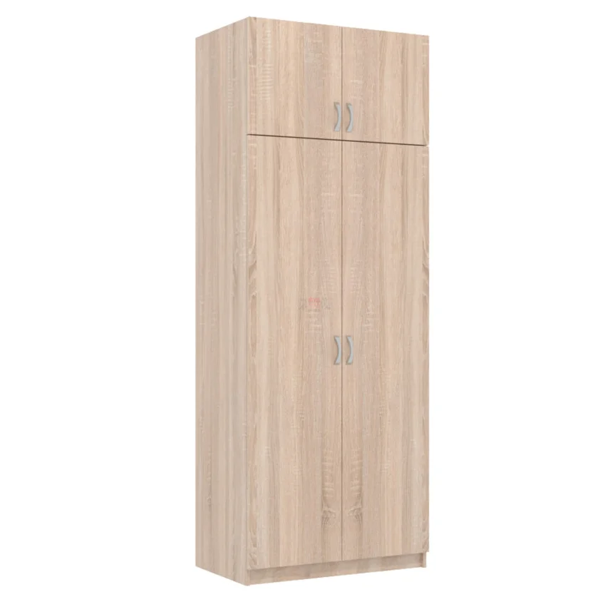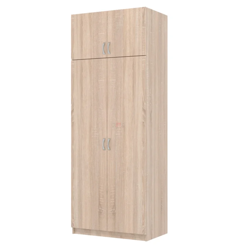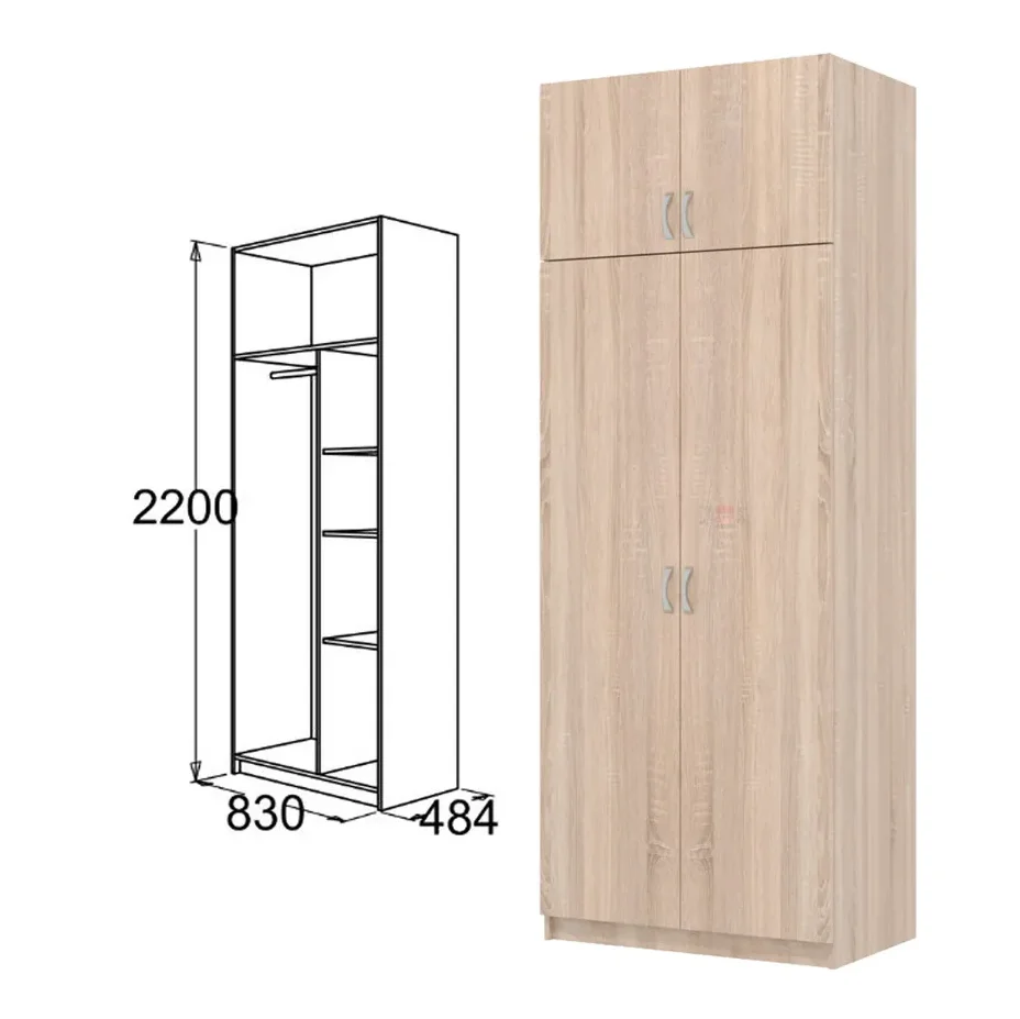Шкаф оснащен двумя дверями, открывающимися в разные стороны, что обеспечивает удобный доступ к содержимому. Внутри шкафа расположены четыре полки, на которых можно разместить одежду, обувь, аксессуары и другие предметы.