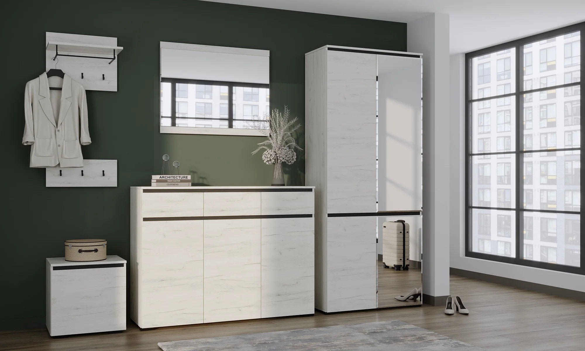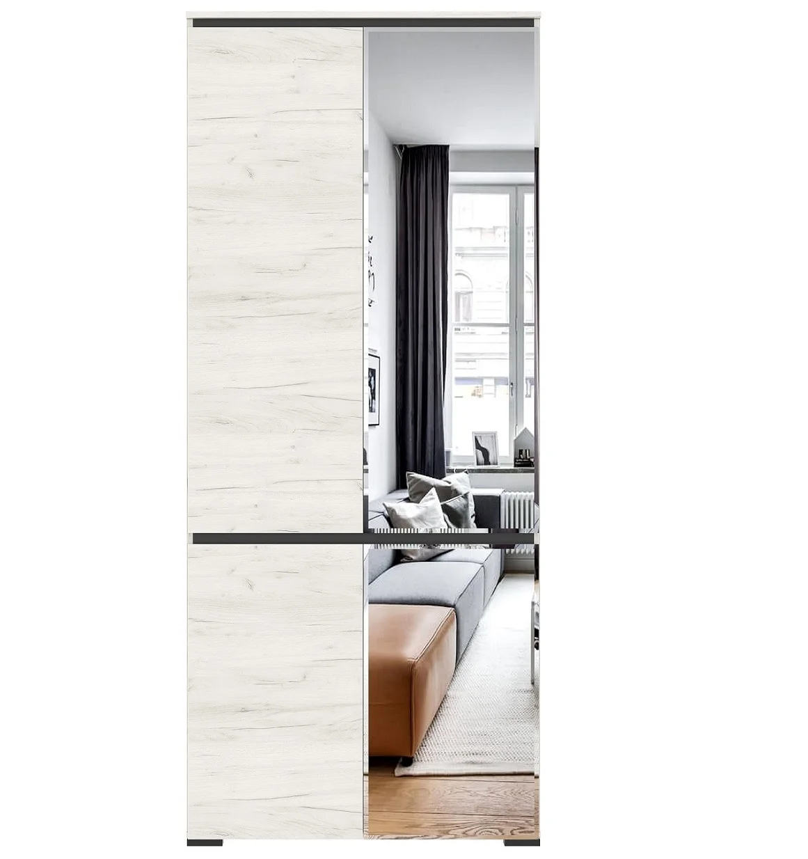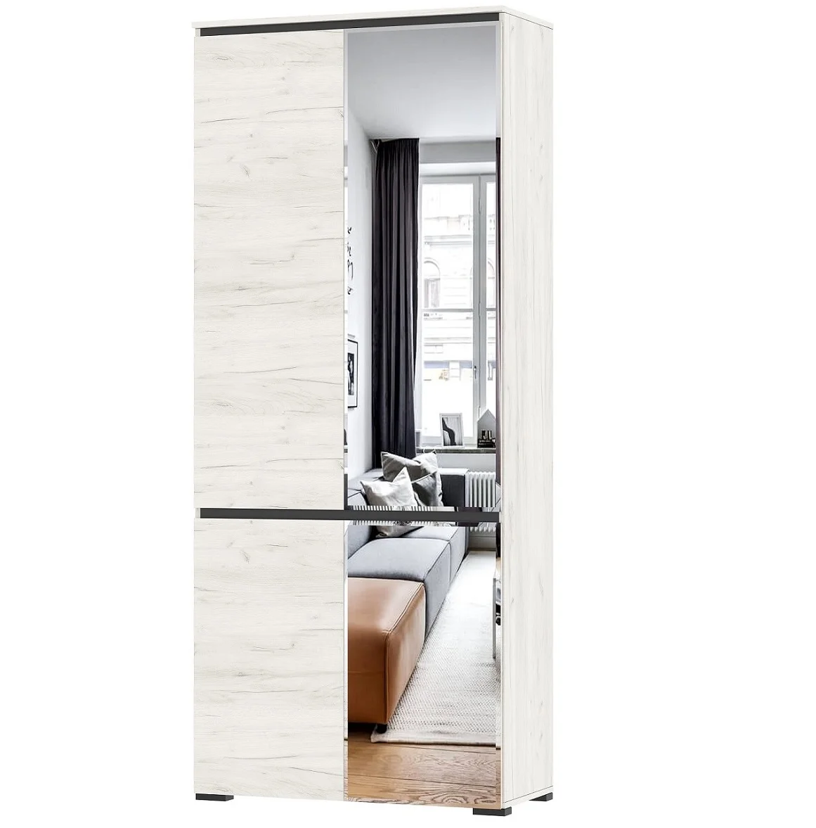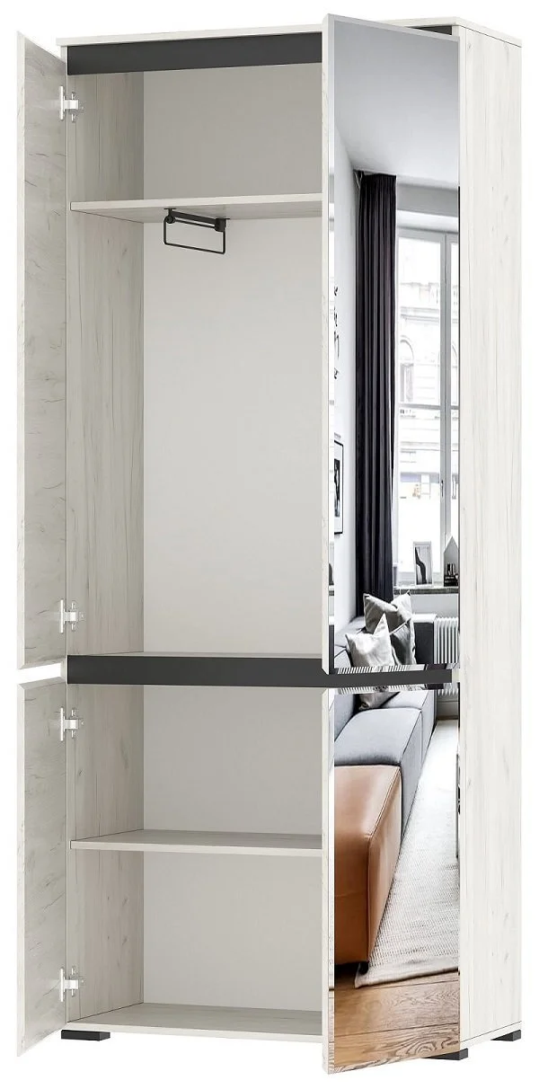 Дизайн шкафа выполнен в скандинавском стиле, что придает ему современный и элегантный вид. Цвет дуб крафт белый и антрацит гармонично сочетаются, создавая уютную и теплую атмосферу в помещении.