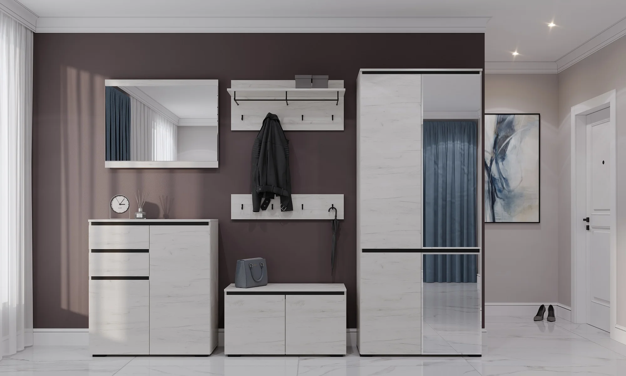 Особенностью шкафа является наличие зеркала на правой стороне, что позволяет визуально увеличить пространство и сделать его более функциональным.