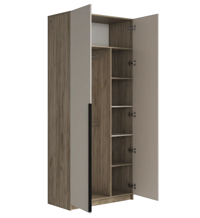 Расстояние: от верхней штанги до пола – 1895 мм, от нижней штанги до пола – 995 мм, между штангами – 915 мм. В секции с полками – четыре полки, которые делят секцию на пять частей.