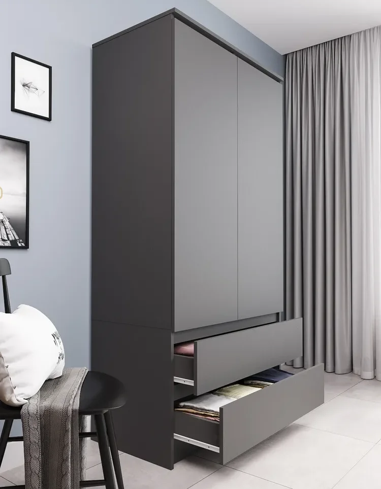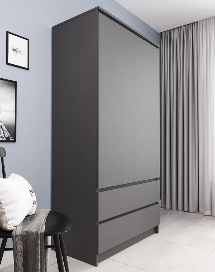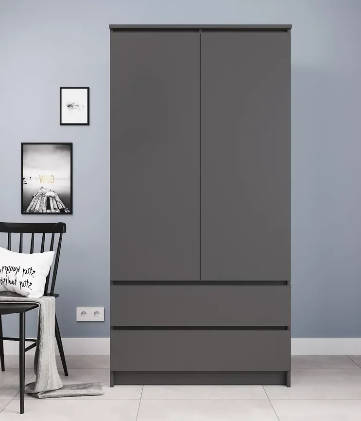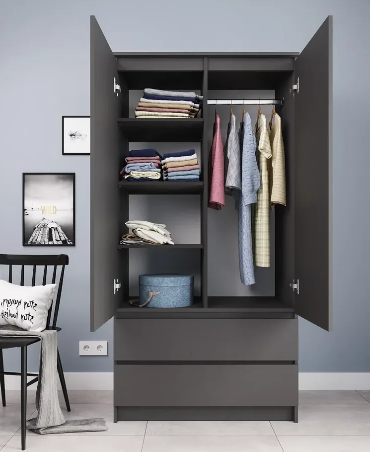 Материал корпуса и фасада - ЛДСП, что обеспечивает прочность и долговечность шкафа. Конструкция шкафа предусматривает наличие двух распашных дверей, двух выдвижных ящиков на роликовых направляющих. Это позволяет удобно разместить одежду, обувь и другие предметы.