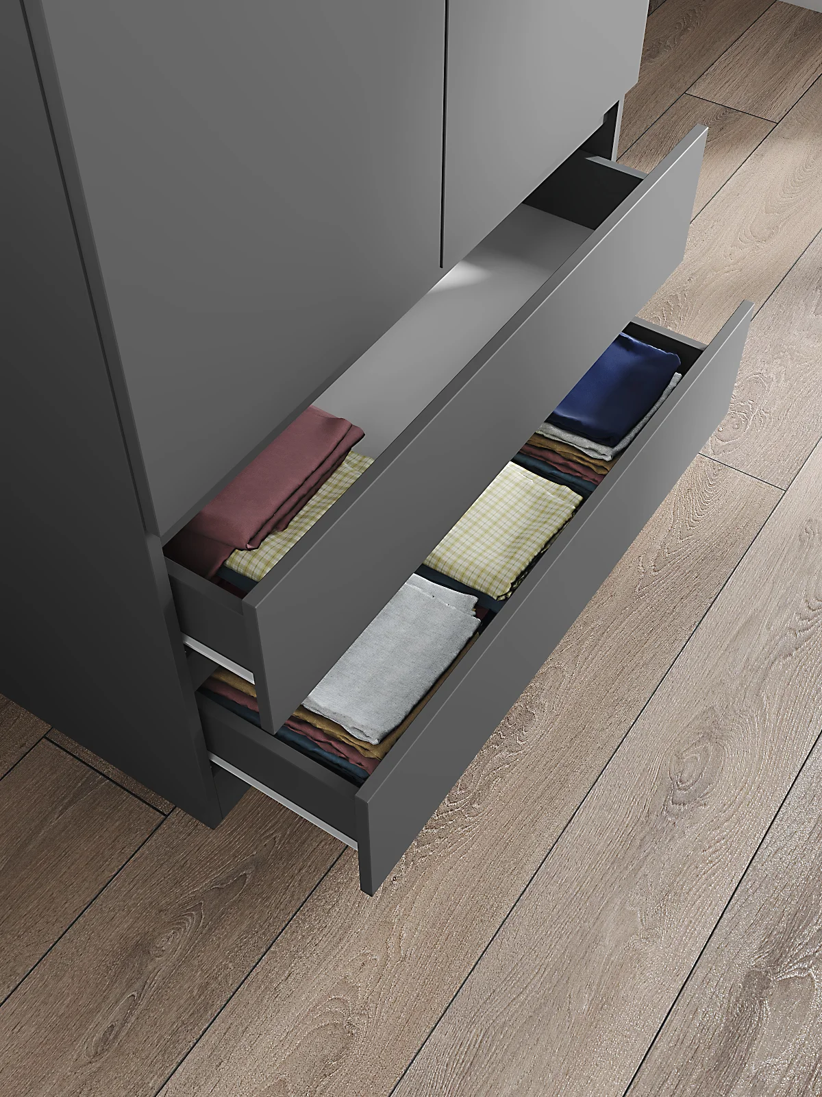 Нижняя часть шкафа - выдвижные ящики на роликовых направляющих 400 мм. Зона хранения ящика (ШхВхГ) - 810 х 100 х 436.