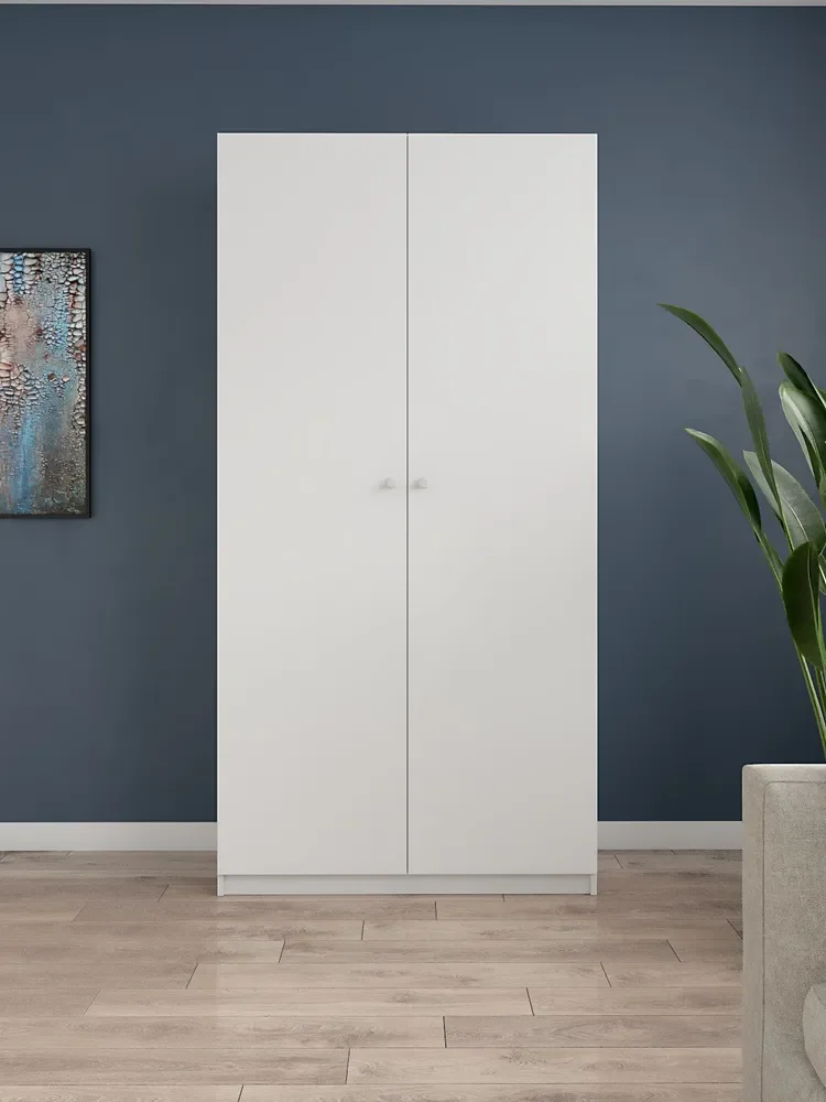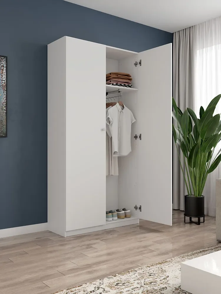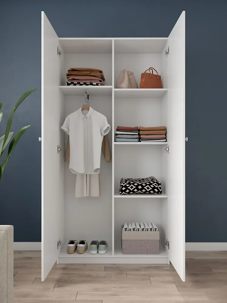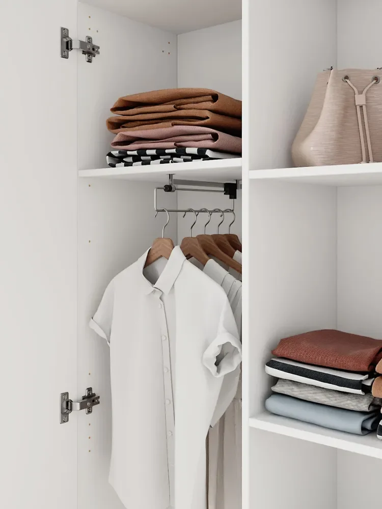Двухдверный шкаф имеет продуманное внутреннее пространство. Одна секция снабжена полками для хранения одежды и белья. Вторая секция оснащена выдвижной штангой, рассчитанной на размещение до 10 вешалок.