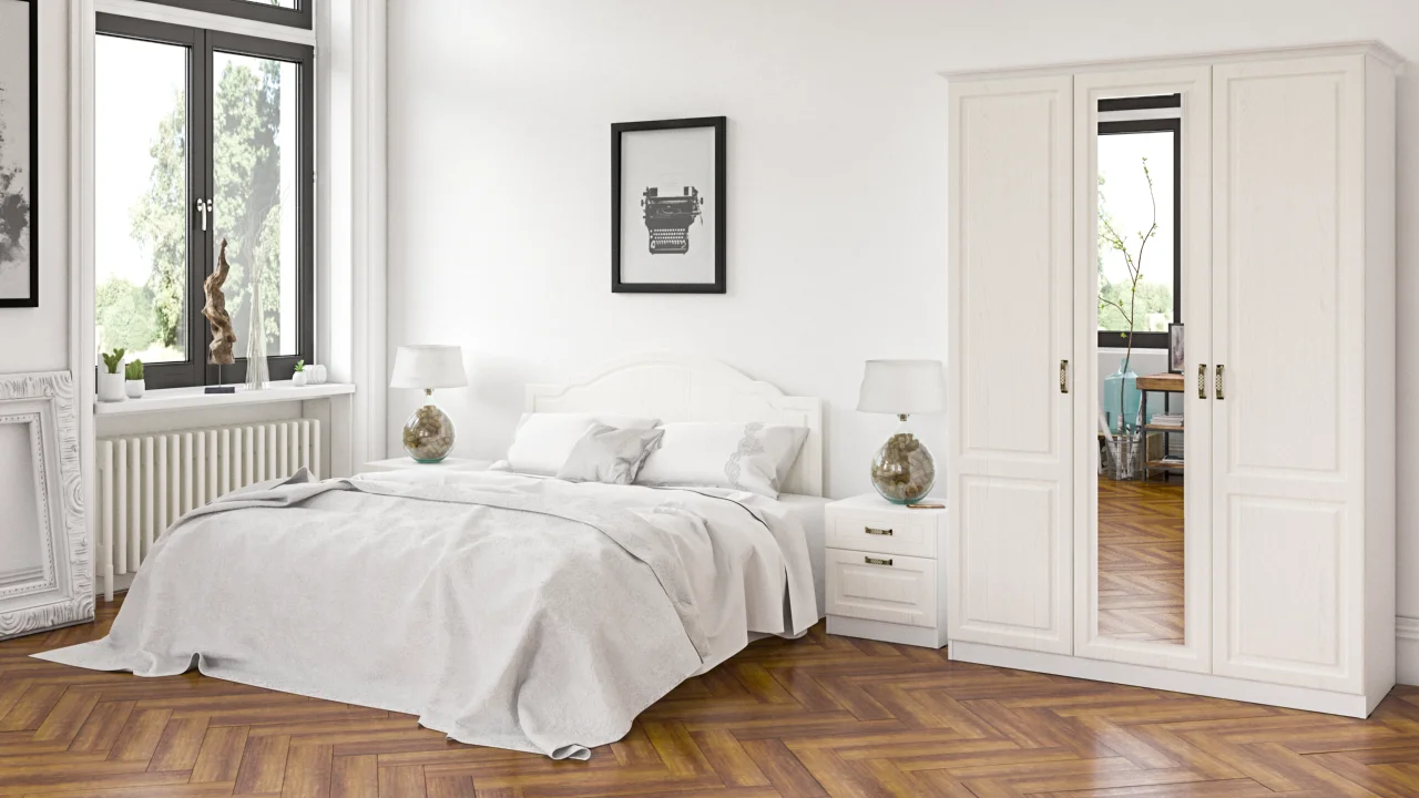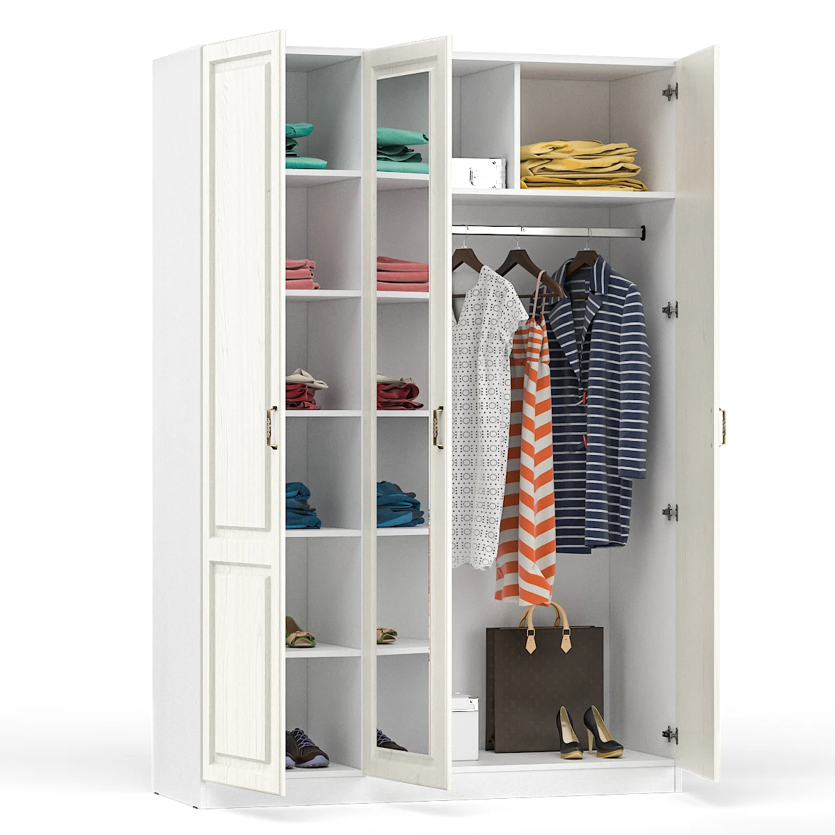 Особенностью шкафа является наличие зеркала в центре, которое не только украшает изделие, но и позволяет увидеть себя в полный рост.