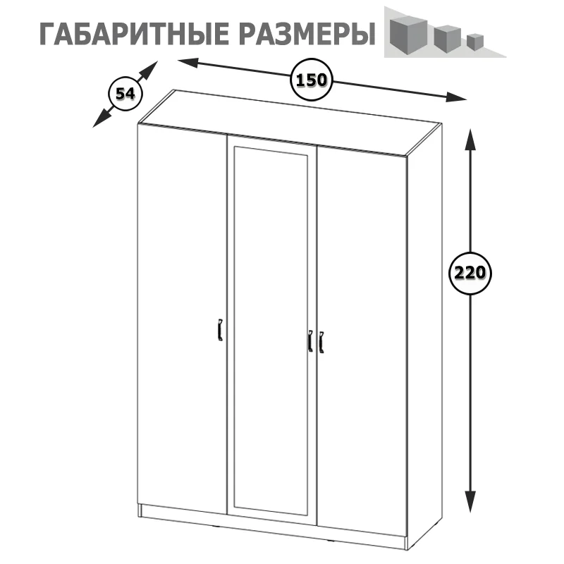 Шкаф имеет размеры ШхГхВ 150 х 54,1 х 220,3 см, что позволяет разместить в нем большое количество одежды и других вещей. Распашные фасады на четырех шарнирных петлях обеспечивают удобство использования и надежность конструкции.