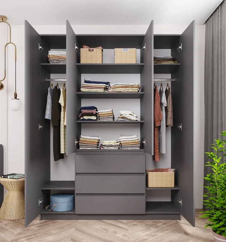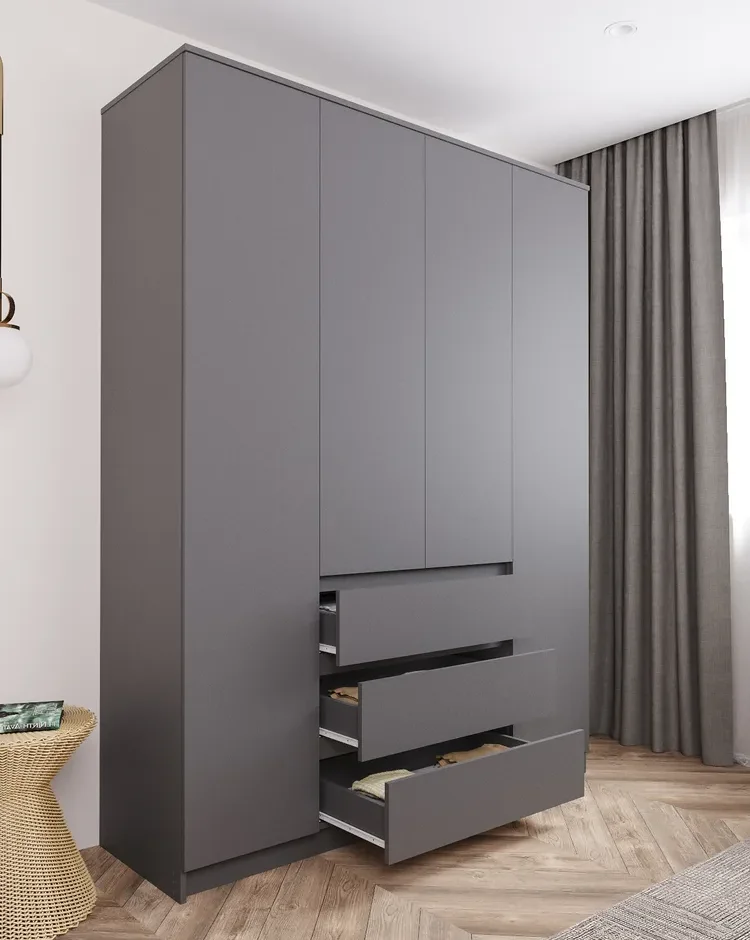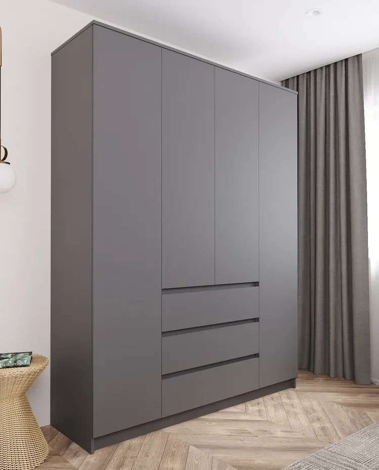 Конструкция позволяет разместить большое количество одежды и других вещей. Конструкция шкафа предусматривает наличие четырех дверей и трех ящиков. Это позволяет организовать удобное хранение одежды, аксессуаров и других предметов. Корпус шкафа изготовлен из качественного ЛДСП, что гарантирует его прочность и долговечность.